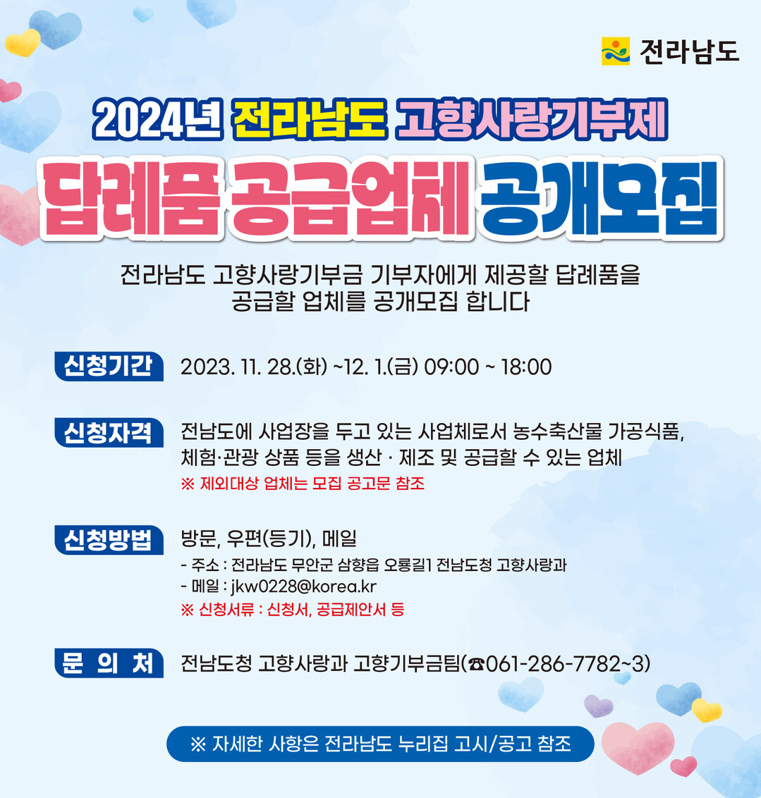 전라남도가 고향사랑기부제 답례품의 다양성 강화와 공급업체에 기부제 참여 기회를 제공하기 위해 2024년도 답례품 공급업체 모집에 나섰다고 28일 밝혔다.