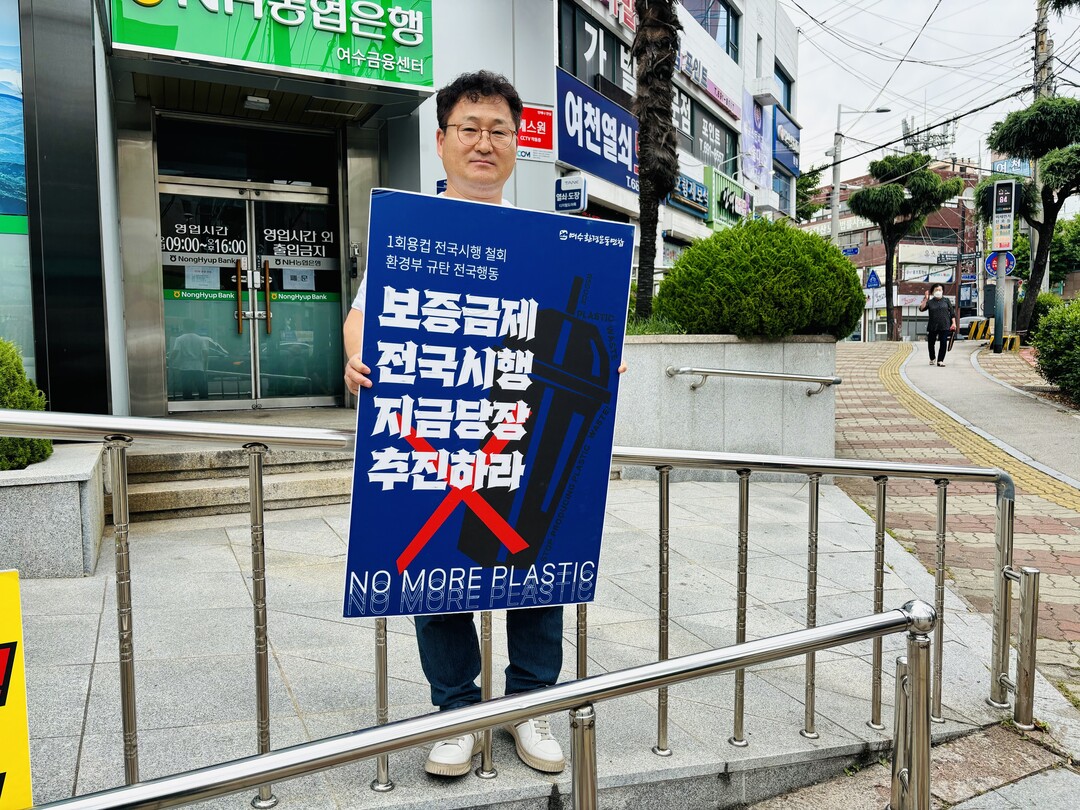 | ▲ 여수환경운동연합이 일회용컵 전국시행 철회 1인 시위를 벌이고 있다. [여수환경운동연합] |
