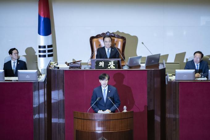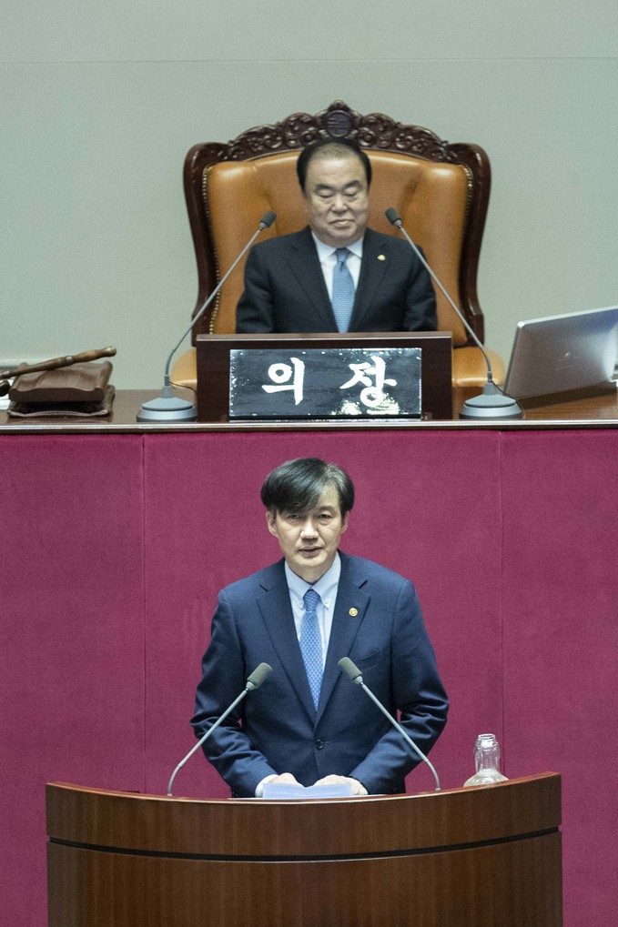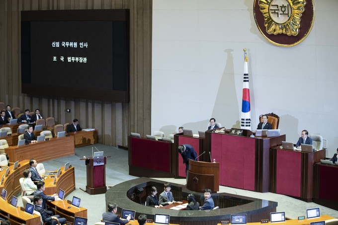 조국 법무부 장관이 26일 오후 서울 여의도 국회에서 열린 제371회 국회(정기회) 제2차 본회의 대정부질문 '정치에 관한 질문'에 출석해 신임 국무위원 인사를 하고 있다.