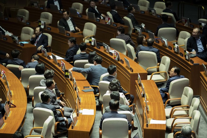 조국 법무부 장관이 26일 오후 서울 여의도 국회에서 열린 제371회 국회(정기회) 제2차 본회의 대정부질문에 출석, 신임 국무위원 인사를 위해 단상에 오르자 한국당 의원들이 등을 돌리고 있다.
