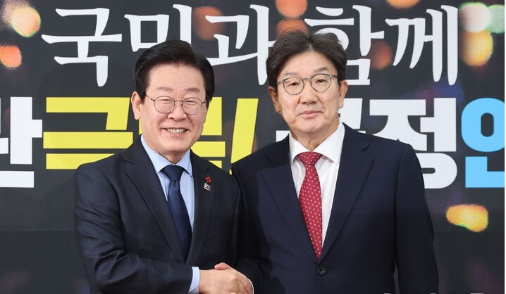 | ▲ 더불어민주당 이재명 대표(왼쪽)가 18일 국회 당 대표실로 예방한 국민의힘 권성동 당대표 권한대행 겸 원내대표와 악수하고 있다. [뉴시스] |