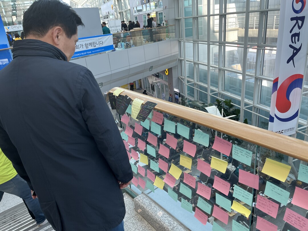| ▲ 2일 한 추모객이 무안국제공항 계단 난간에 붙어있는 희생자 추모 메모지를 보고 있다. [강성명기자] |