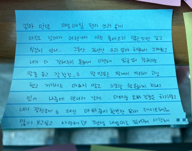 "나 엄마랑 술마시고 싶었는데, 이모랑 간 태국은 재밌었어? 나한테 연락 안 한 거 보니 시간 가는 줄 모르고 즐겼나 보네, 나 엄마 없이 해본 게 없는데 할 수 있겠지? 엄마처럼 사람들 도우면서 살게 보고싶어 사랑해"라고 적혀 있다.