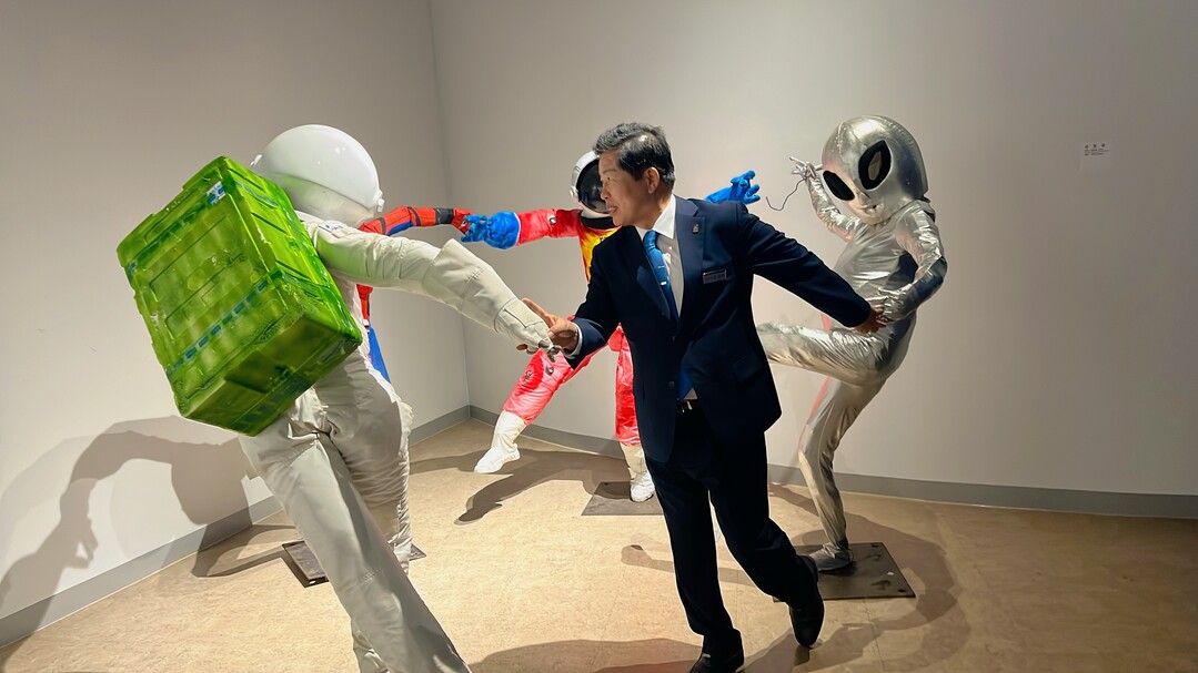 | ▲ 3일 공영민(왼쪽 다섯번째) 전남 고흥군수가 우주미술관 미디어아트관에 전시된 우주인과 손을 잡고 기념촬영을 하고 있다. [강성명 기자] |
