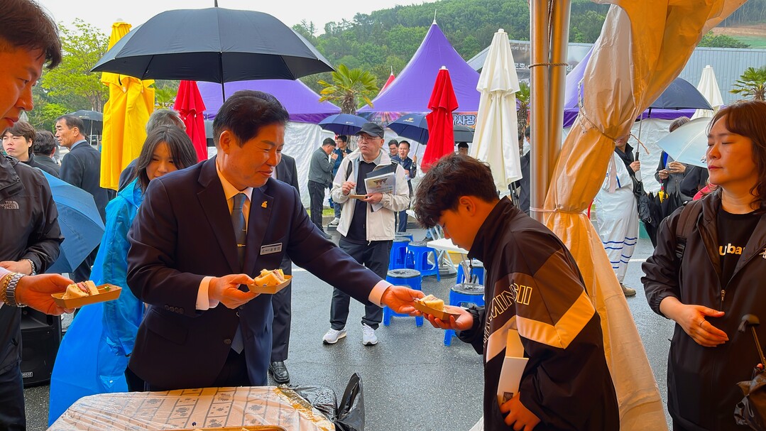 | ▲ 공영민 고흥군수가 3일 제15회 고흥우주항공축제 현장에서 만들어진 우주식량을 관광객에게 나눠주고 있다. [강성명 기자] |