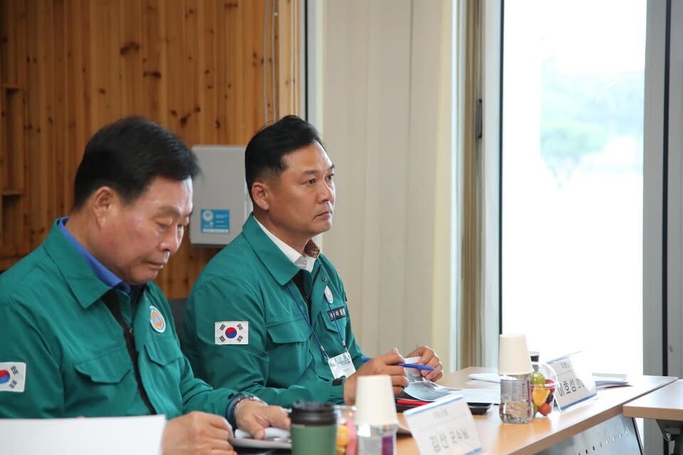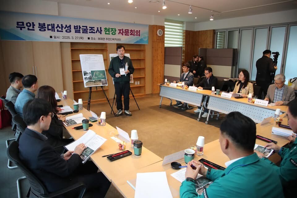 | ▲ 지난 27일 김산 전남 무안군수와 이호성 무안군의회 의장이 해제 봉대산성 발굴조사 현장에서 국가유산청과 함께 축성 방식과 연대 등 역사적 가치를 조명하고 보존과 정비 기획계획 수립을 위해 논의를 하고 있다. [이호성 의장 페이스북 갈무리] |
