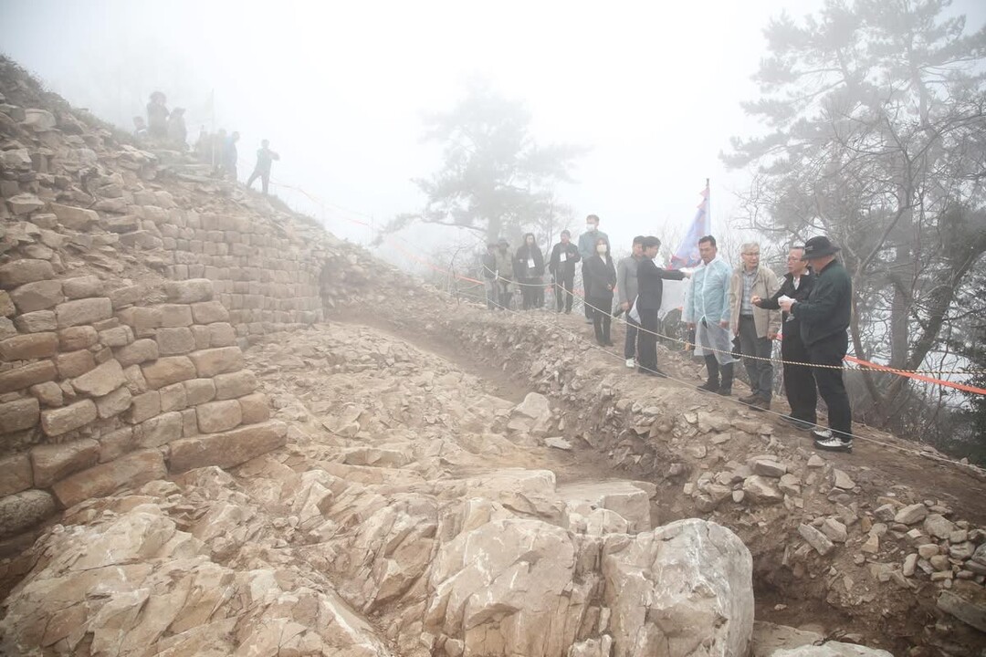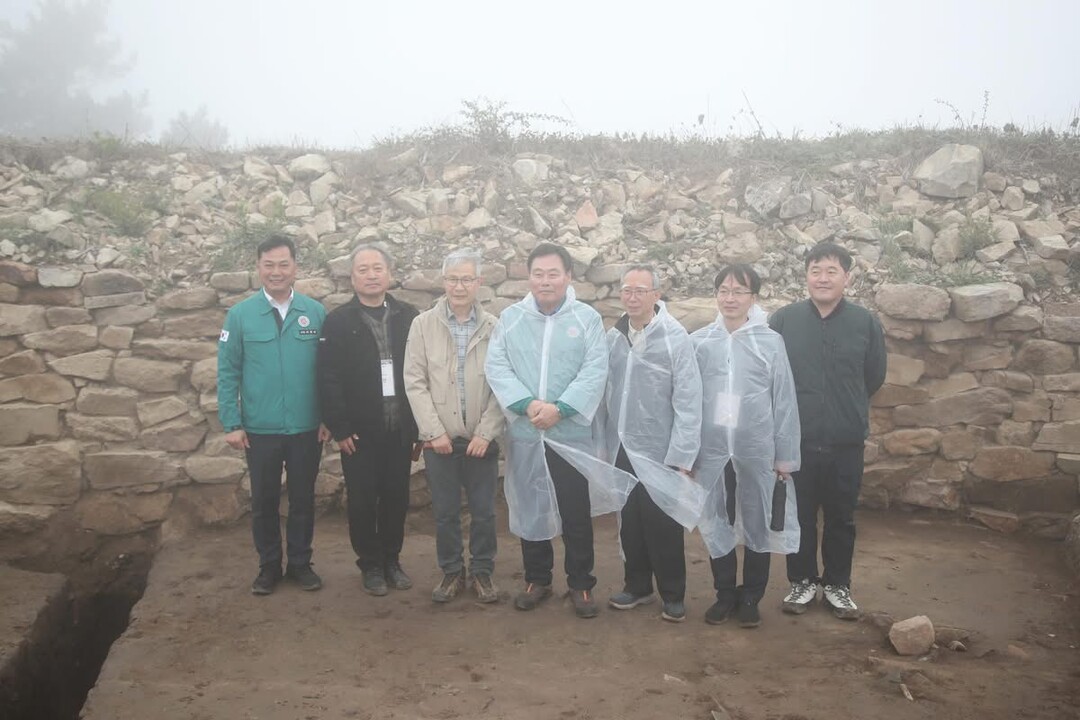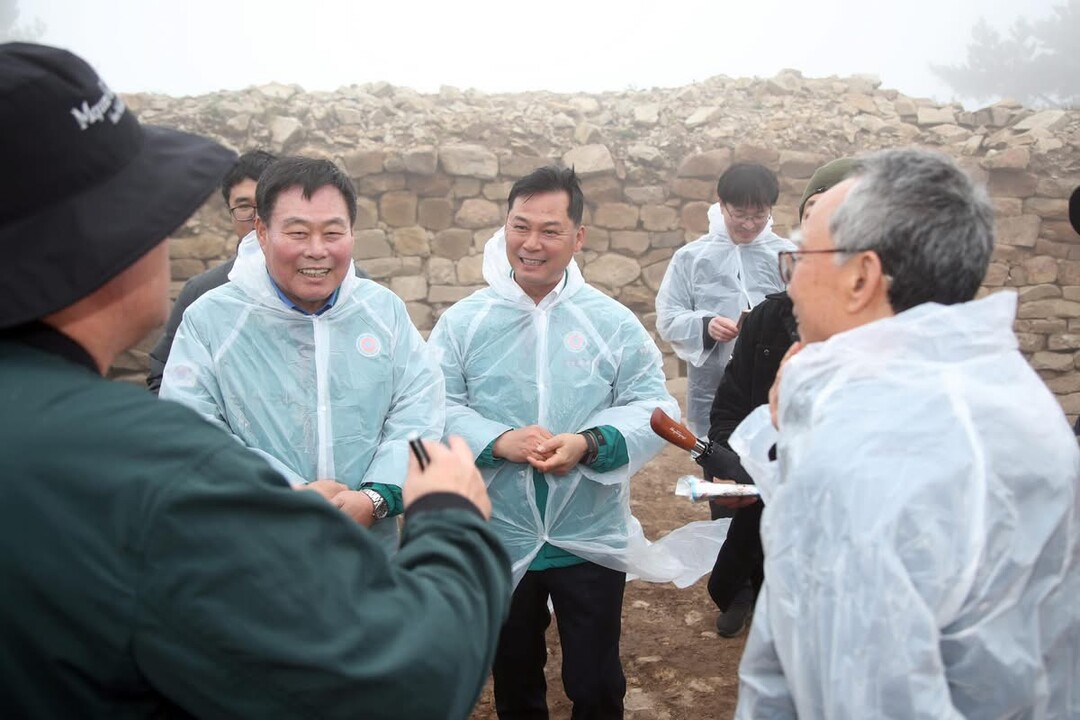 | ▲ 지난 27일 김산 전남 무안군수와 이호성 무안군의회 의장이 해제 봉대산성 발굴조사 현장에서 국가유산청과 함께 축성 방식과 연대 등 역사적 가치를 조명하고 보존과 정비 기획계획 수립을 위해 논의를 한 뒤 기념촬영을 하고 있다. [이호성 의장 페이스북 갈무리] |
