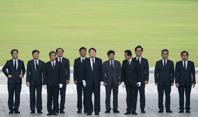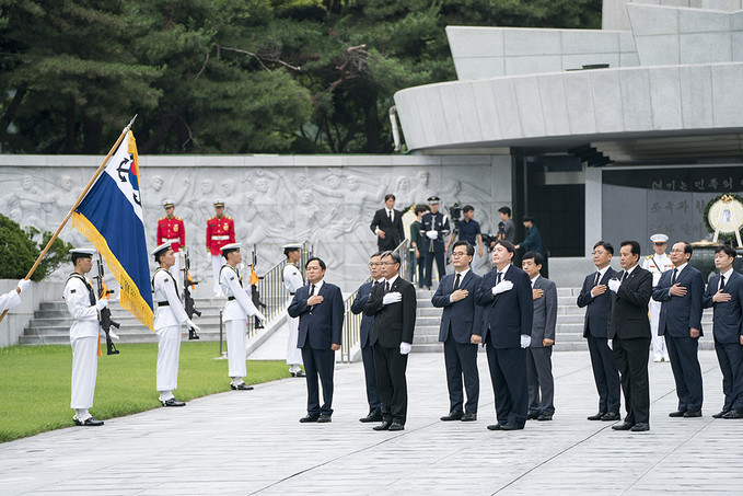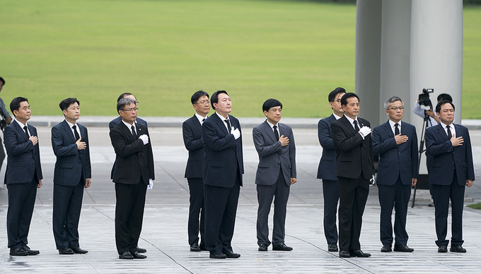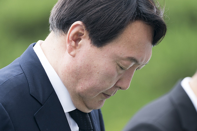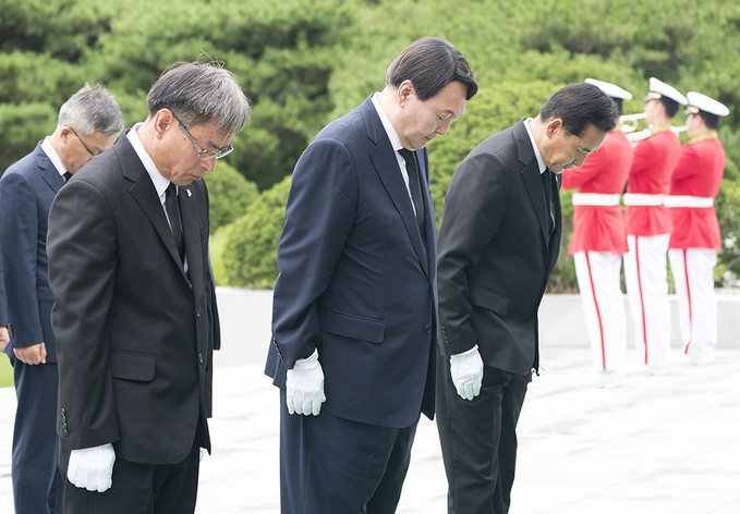 윤석열 신임 검찰총장이 25일 오후 서울 동작구 국립서울현충원을 찾아 현충탑 앞에서 묵념을 하고 있다.