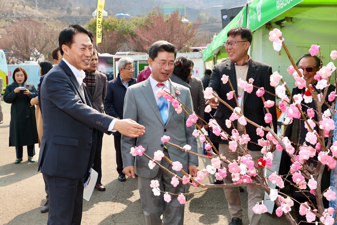 | ▲ 지난 7일 개막식에서 정인화 (가운데) 광양시장과 김기홍 부시장이 활짝 핀 매화를 감상하고 있다. [광양시 제공] |