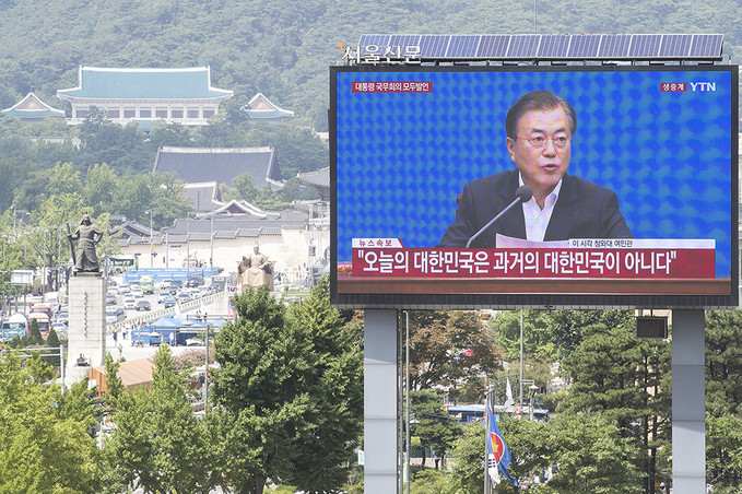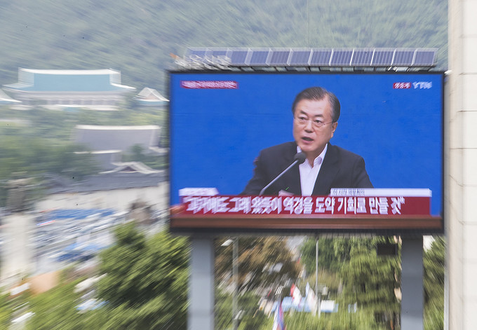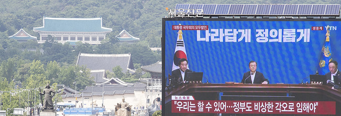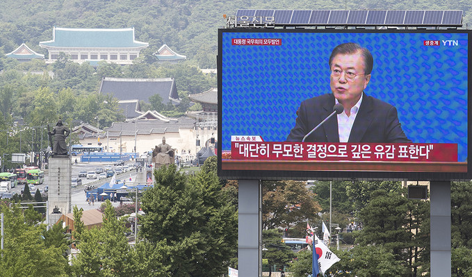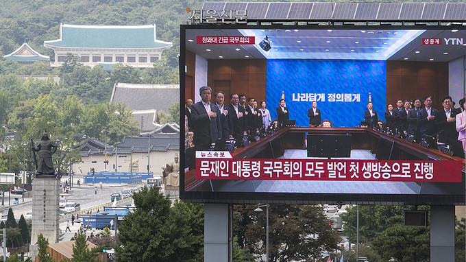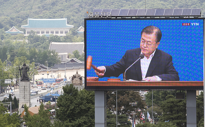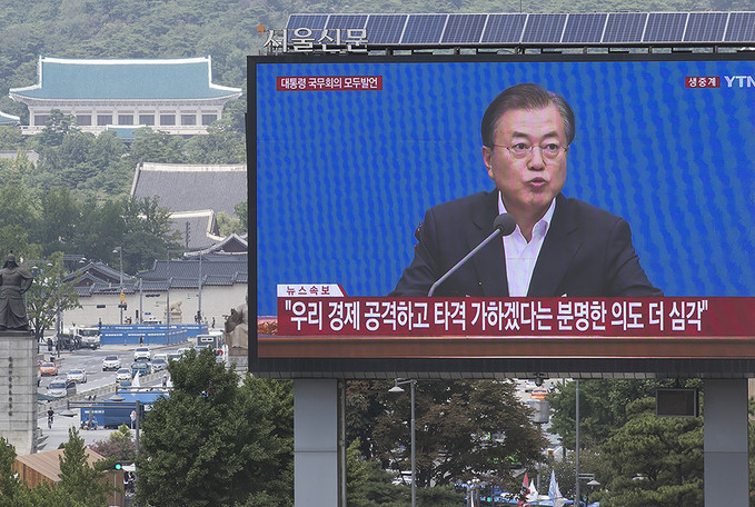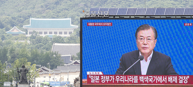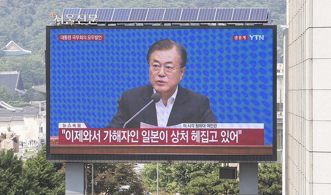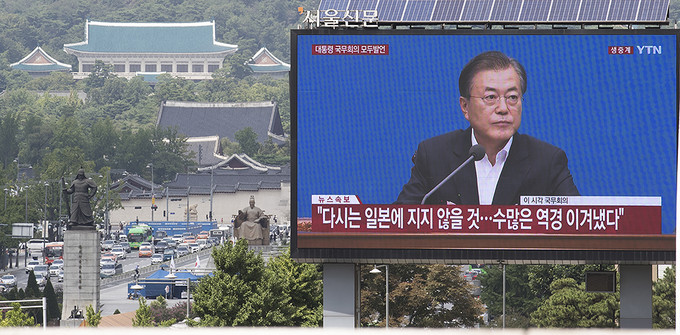 일본이 '화이트리스트'(전략물자 수출심사 우대국 목록)에서 한국을 제외하는 수출무역관리령 개정안을 각의에서 처리한 2일 오후 서울 중구 프레스센터 앞 대형 옥외광고판에 문재인 대통령의 임시 국무회의 모두발언이 생중계되고 있다.