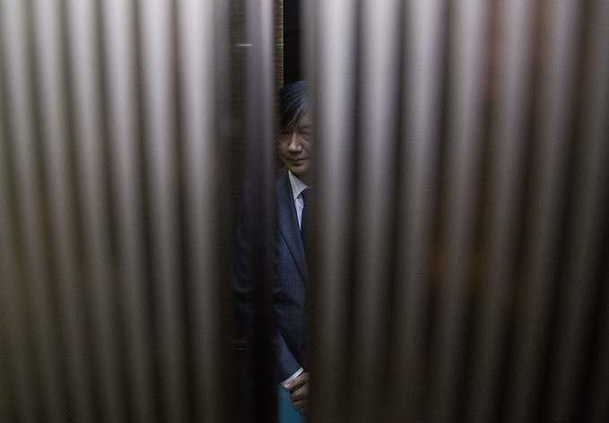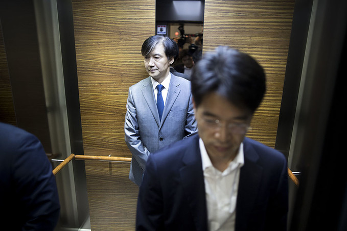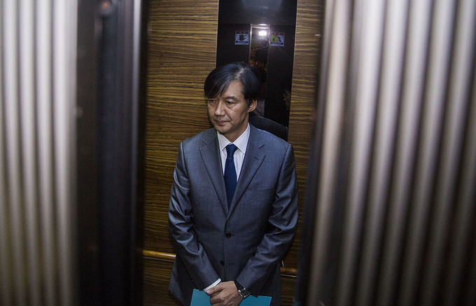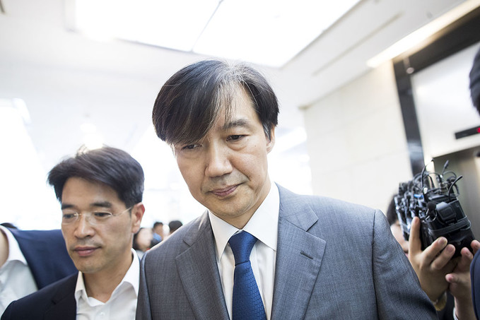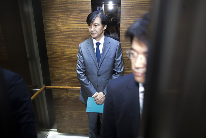 조국 법무부 장관 후보자가 23일 오후 인사청문회 준비 사무실이 마련된 서울 종로구 적선현대빌딩에서 기자회견을 열고 입장을 발표한 뒤 사무실로 올라가고 있다.