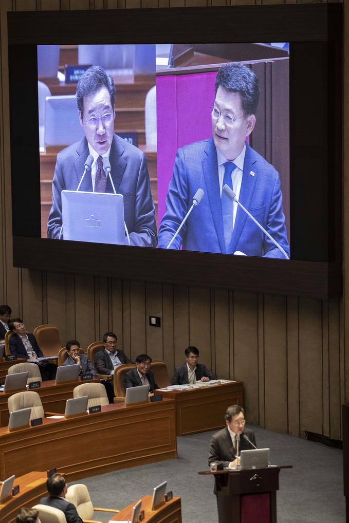 이낙연 국무총리(왼쪽)가 30일 오후 서울 여의도 국회에서 열린 제371회 국회(정기회) 제4차 본회의에 출석해 더불어민주당 송영길 의원 질의에 답하고 있다.