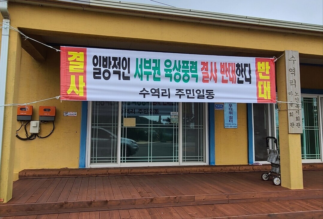 | ▲ 지난달부터 전남 진도군 수역리 마을 주민들이 육상 풍력발전 사업에 반대하는 현수막을 마을회관에 내걸었다. [강성명 기자] |