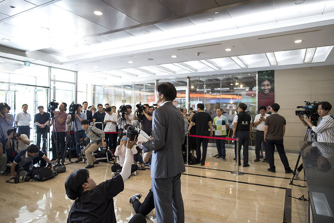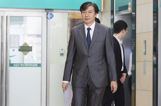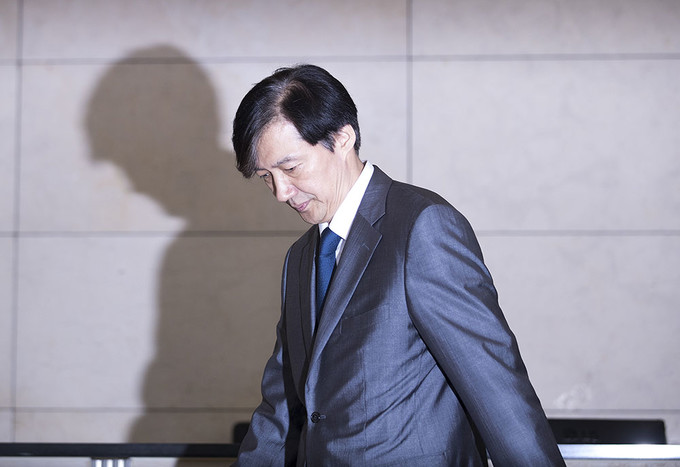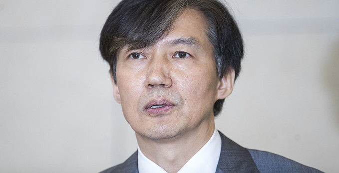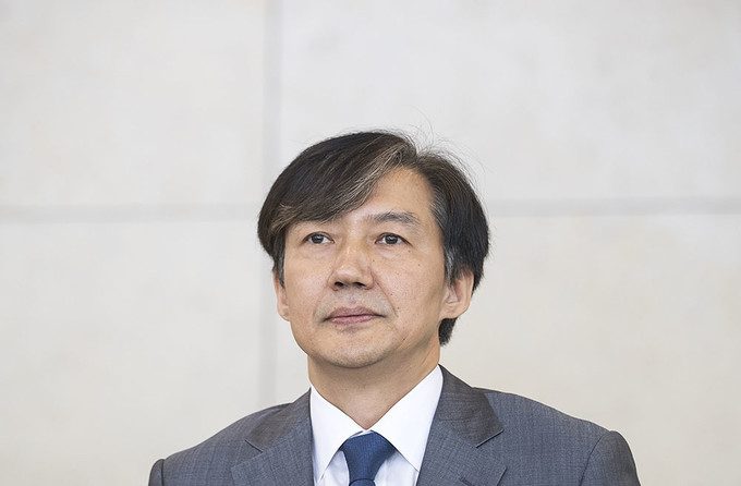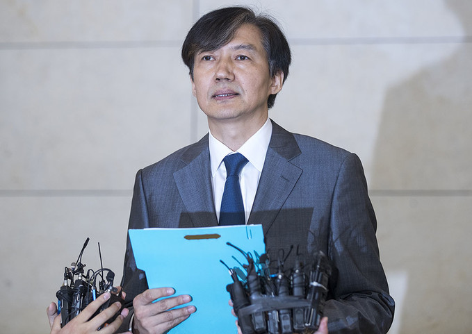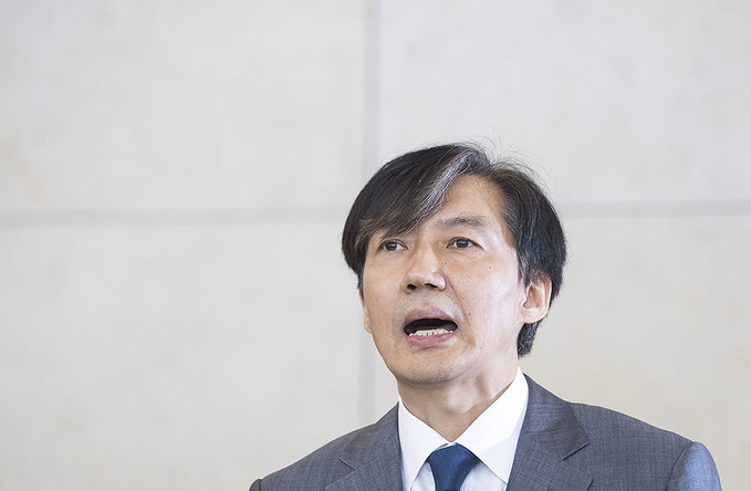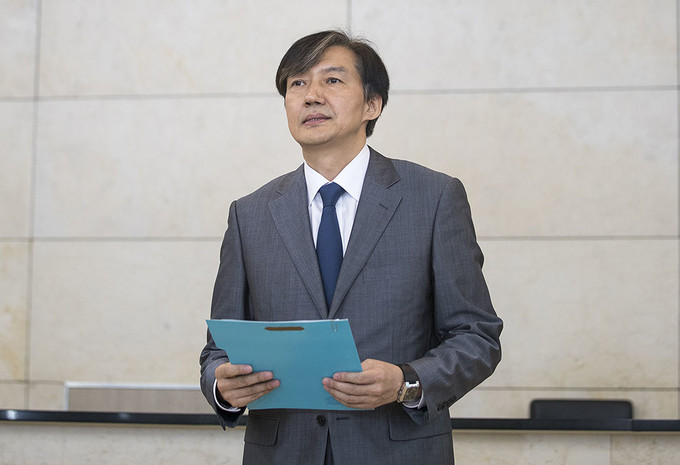조국 법무부 장관 후보자가 23일 오후 인사청문회 준비 사무실이 마련된 서울 종로구 적선현대빌딩에서 기자회견을 열고 입장을 발표하고 있다.