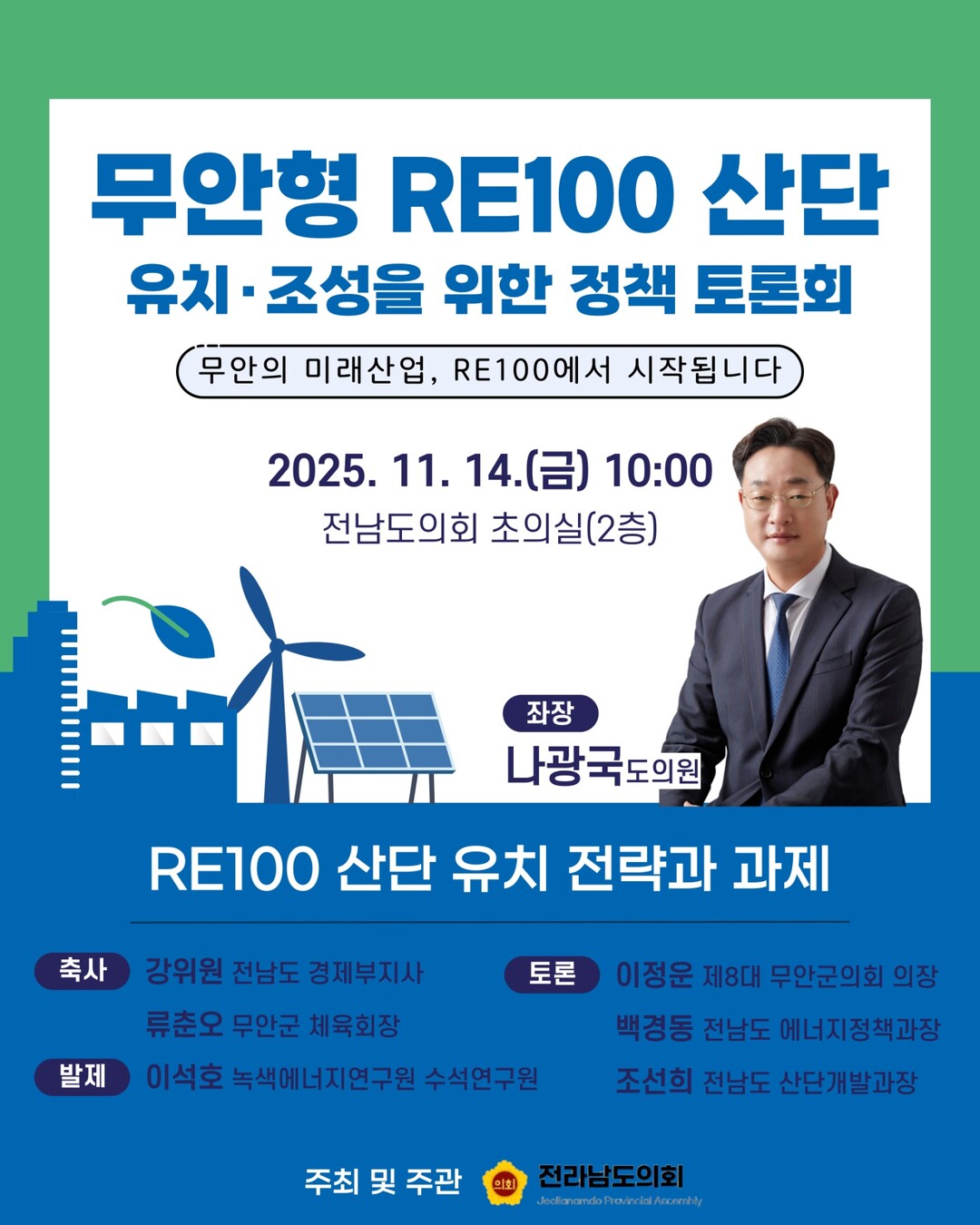 | ▲ 전남 무안형 RE100산단 유치 조성 정책 토론회 포스터 [나광국 전남도의원 제공] |