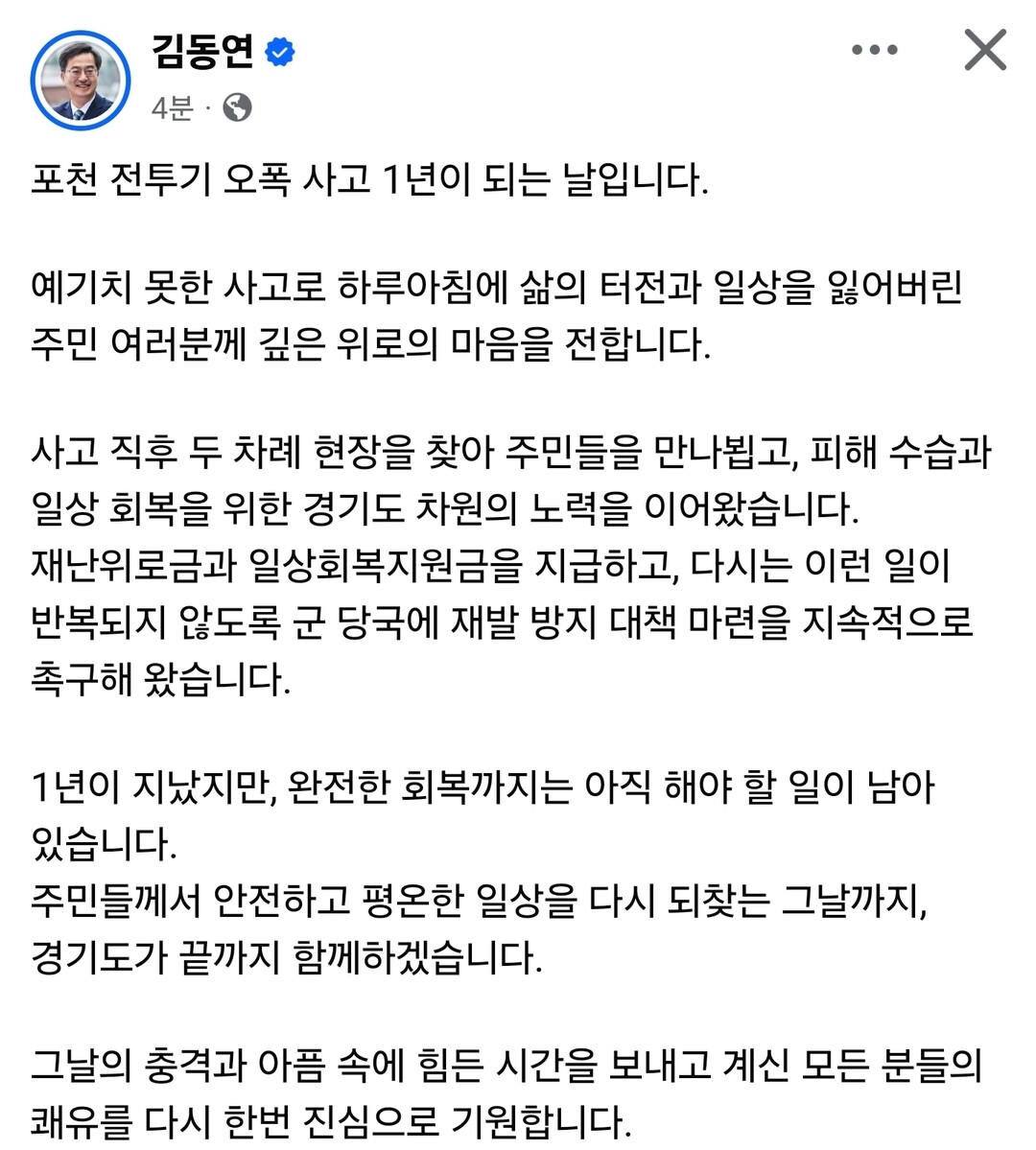 또 "사고 직후 두 차례 현장을 찾아 주민들을 만나 뵙고, 피해 수습과 일상 회복을 위한 경기도 차원의 노력을 이어왔다. 재난위로금과 일상회복지원금을 지급하고, 다시는 이런 일이 반복되지 않도록 군 당국에 재발 방지 대책 마련을 지속적으로 촉구해 왔다"고 전했다.