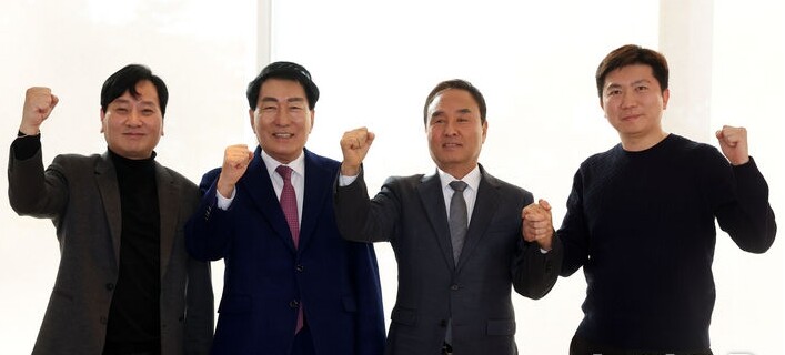 | ▲ 대한체육회장 선거에 출마한 박창범(왼쪽부터) 전 대한우슈협회장, 안상수 전 인천시장, 강신욱 단국대 명예교수, 유승민 전 대한탁구협회장이 17일 서울 마포구 나루 호텔에서 후보 단일화를 위한 4자 회동을 갖고 기념촬영하고 있다. [뉴시스] |