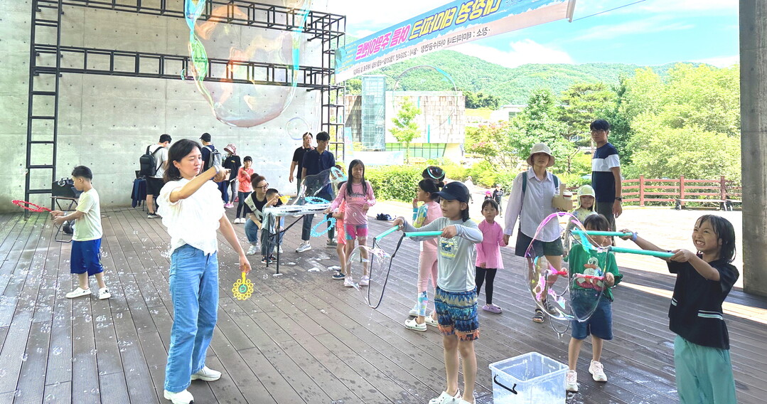 | ▲ 대형 비눗방울과 함께하는 버블쇼에 참여한 어린이들이 비눗방울을 만들며 즐거워하고 있다. [합천군 제공] |