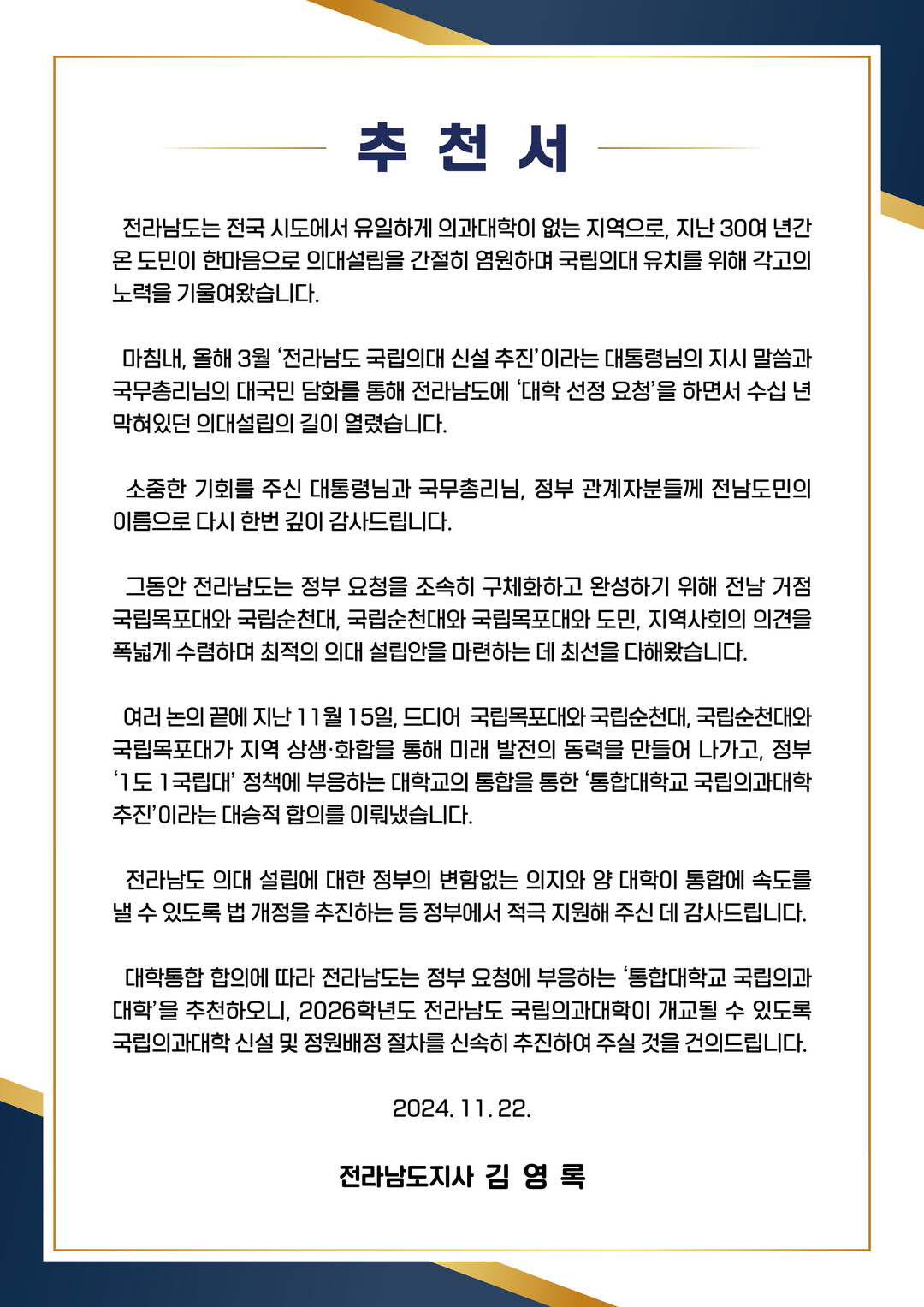전라남도가 대통령실과 국무총리실, 교육부, 보건복지부에 '통합대학교 국립의과대학' 추천서를 제출했다고 22일 밝혔다.