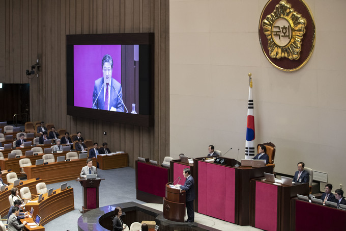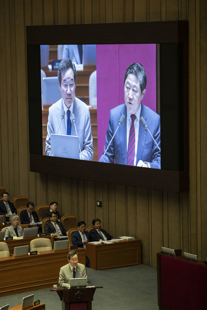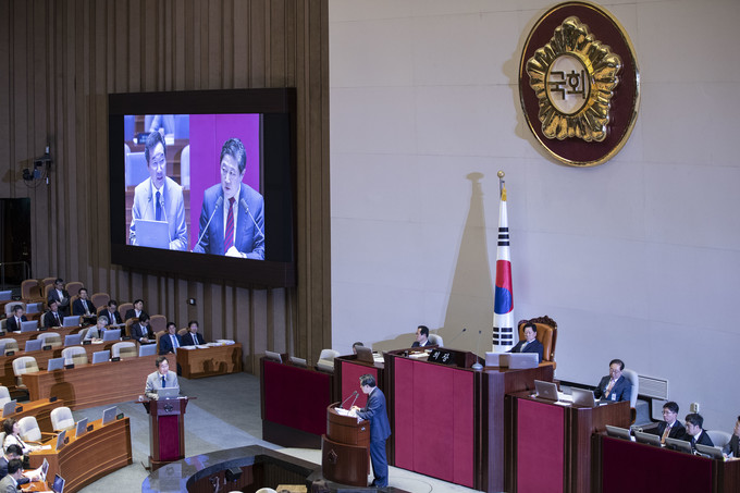 이낙연 국무총리(왼쪽)가 9일 오후 서울 여의도 국회에서 열린 본회의 '대정부 질문'에 출석해 자유한국당 유기준 의원 질의에 답하고 있다.