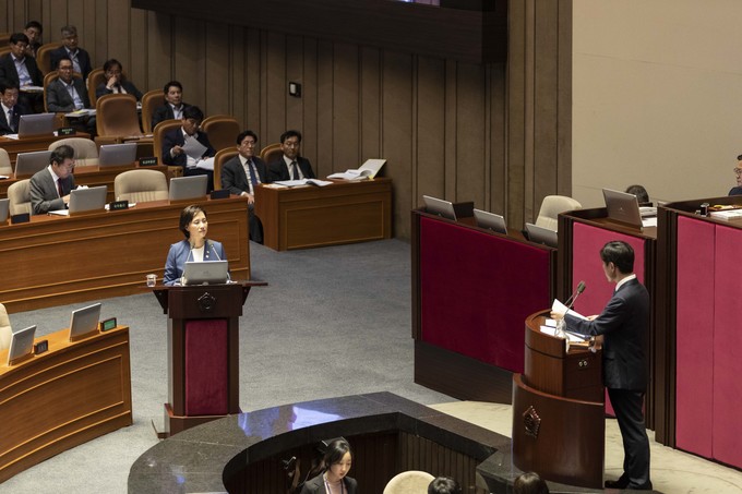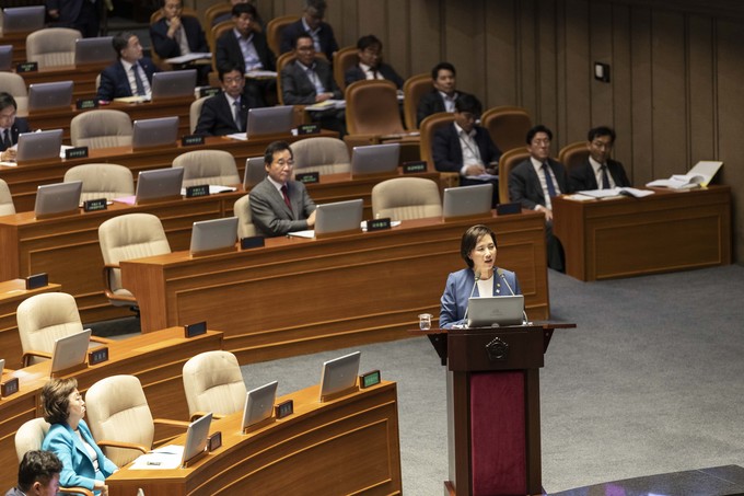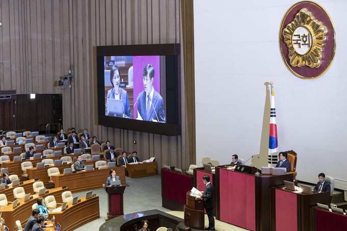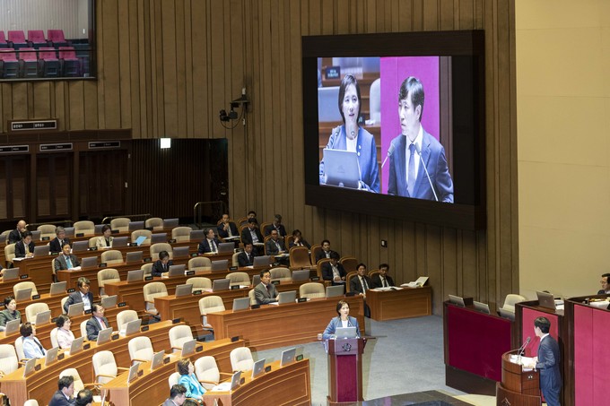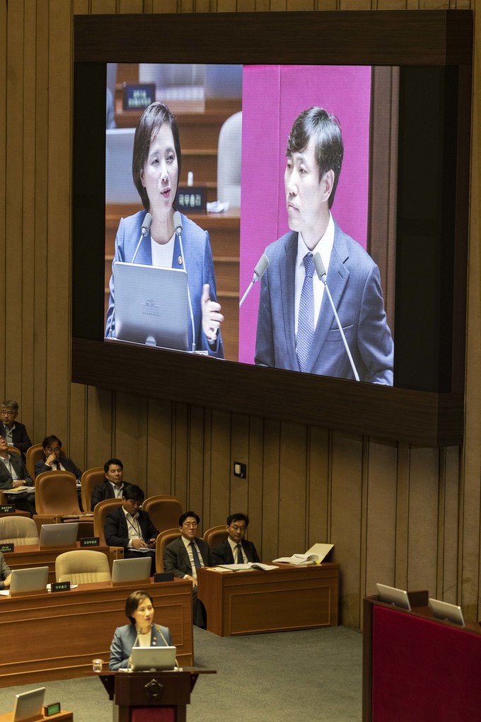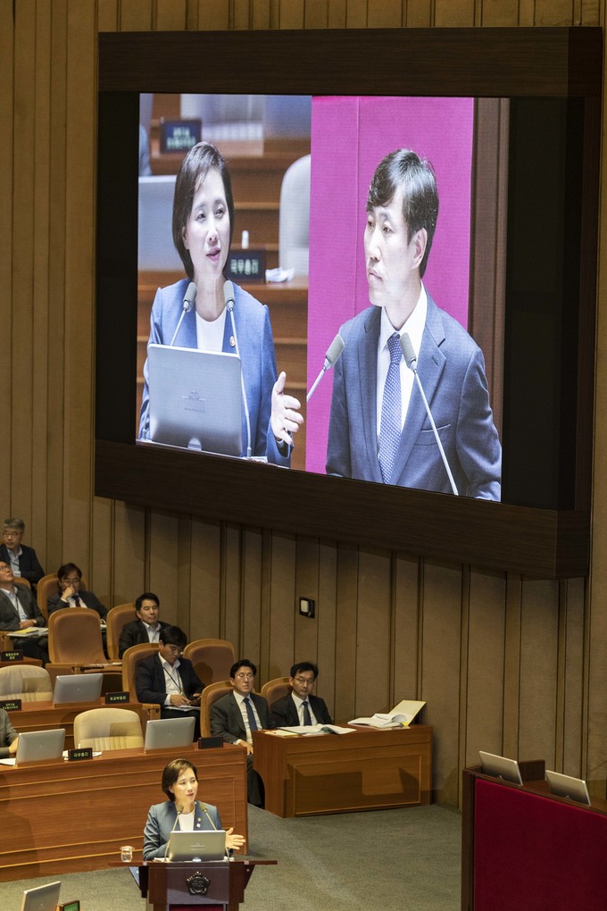 유은혜 사회부총리(왼쪽)가 11일 오후 서울 여의도 국회에서 열린 본회의 대정부 질문에 출석해 바른미래당 하태경 의원 질의에 답하고 있다.