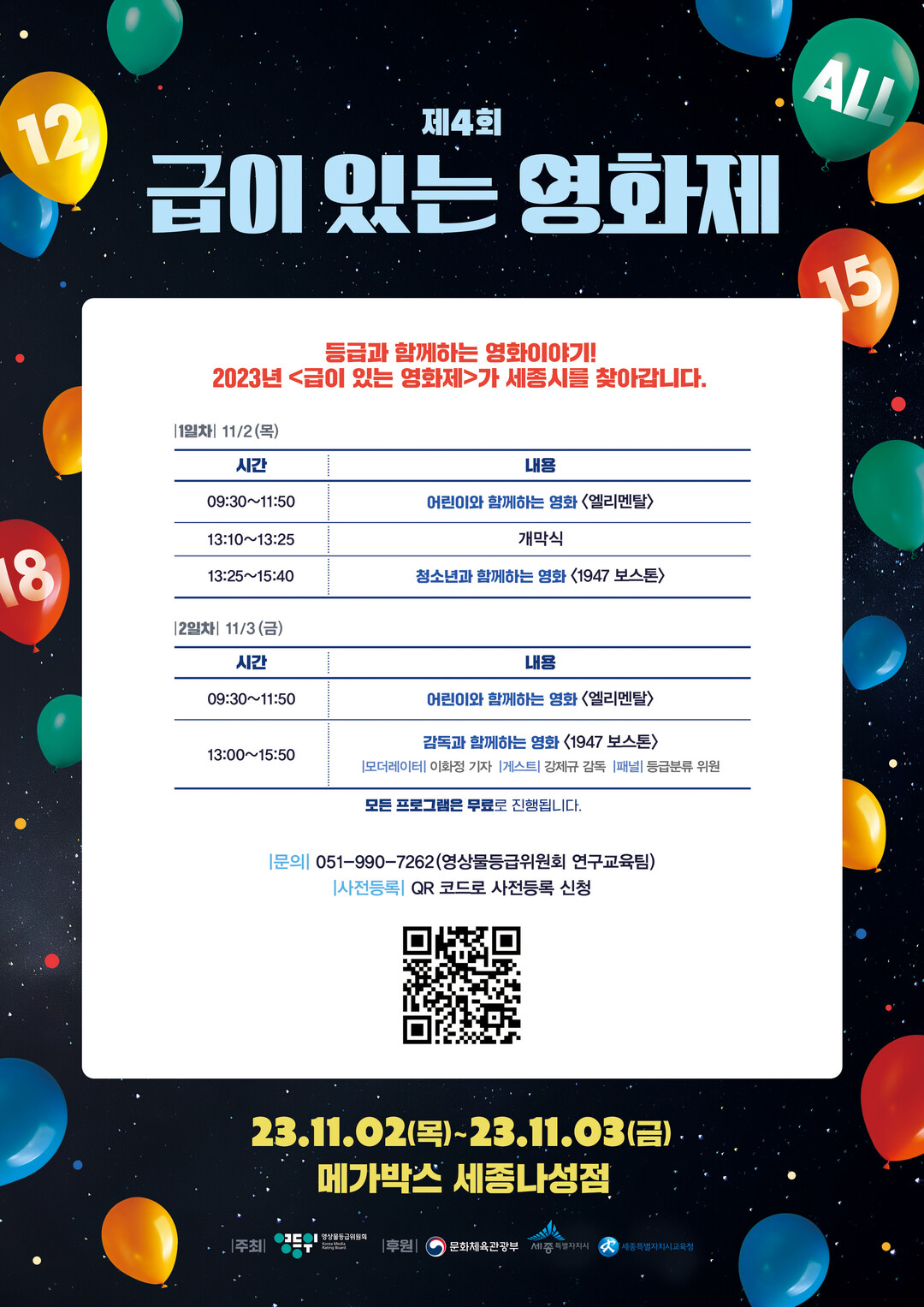올해로 4회째를 맞는 급이 있는 영화제는 영화 관람, 선택시 필수 정보로 활용되는 등급 분류 제도를 보다 쉽게 알아가고 체험하는 특별한 영화제다. 특히 이번 영화제는 처음으로 영등위가 위치한 부산을 벗어나 세종시에서 시민들과 적극적으로 소통하기 위해 열린다.
