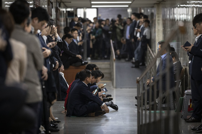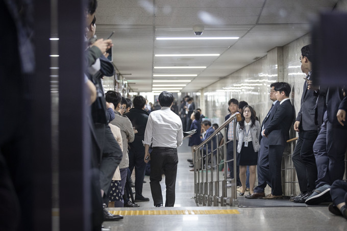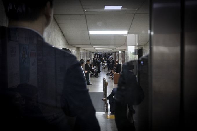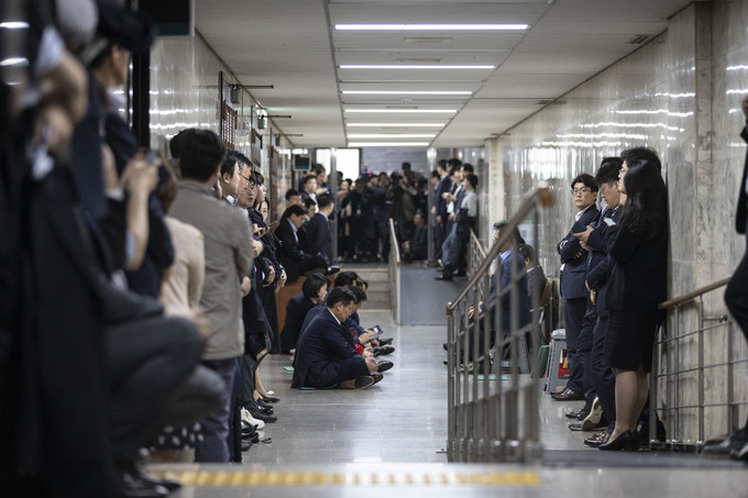 자유한국당 의원들이 25일 오후 서울 여의도 국회 사법개혁특별위원회 회의실 앞을 막아서고 있다.