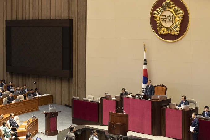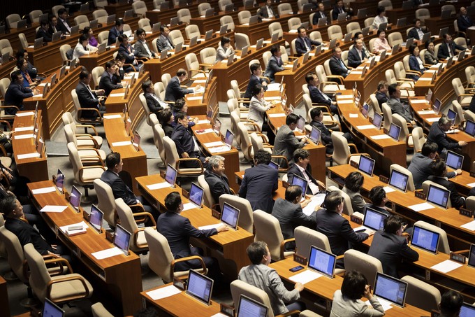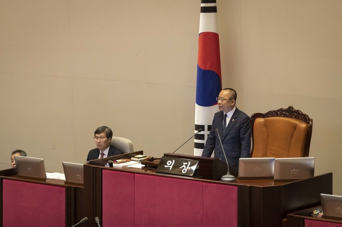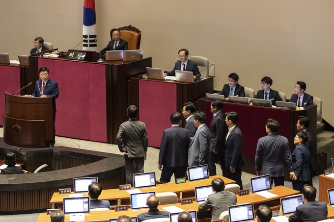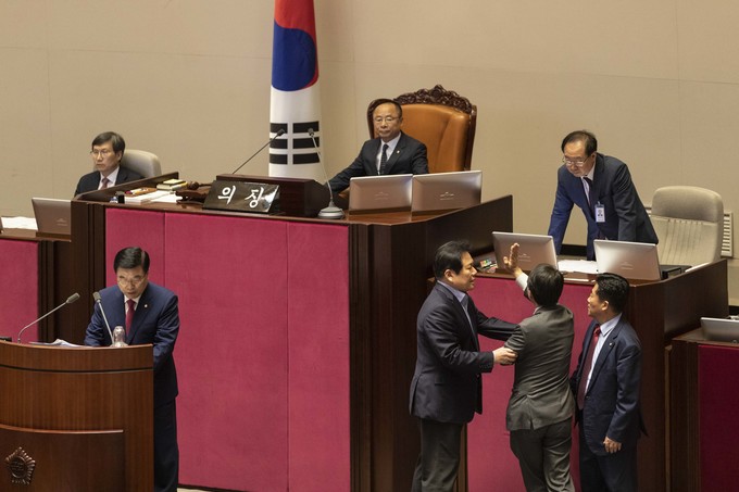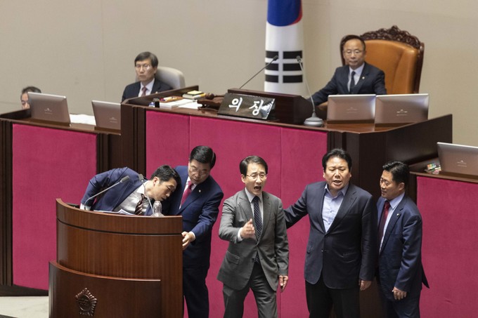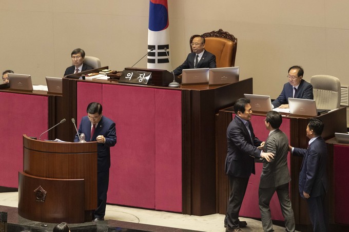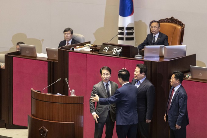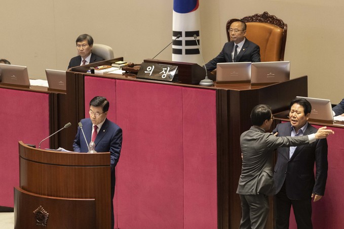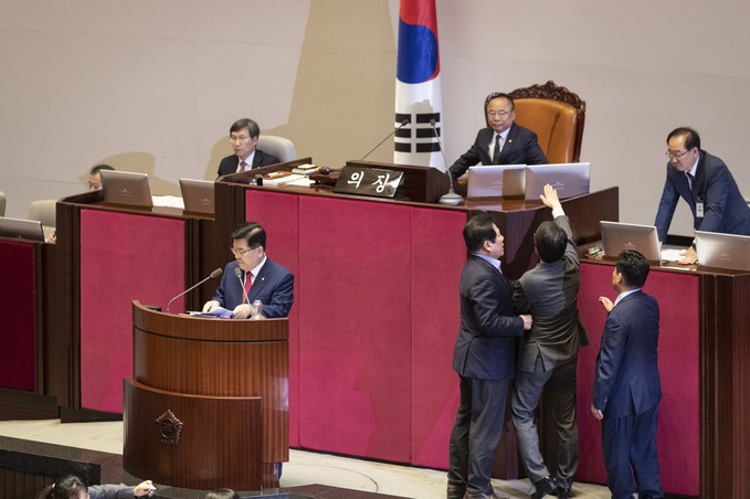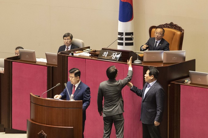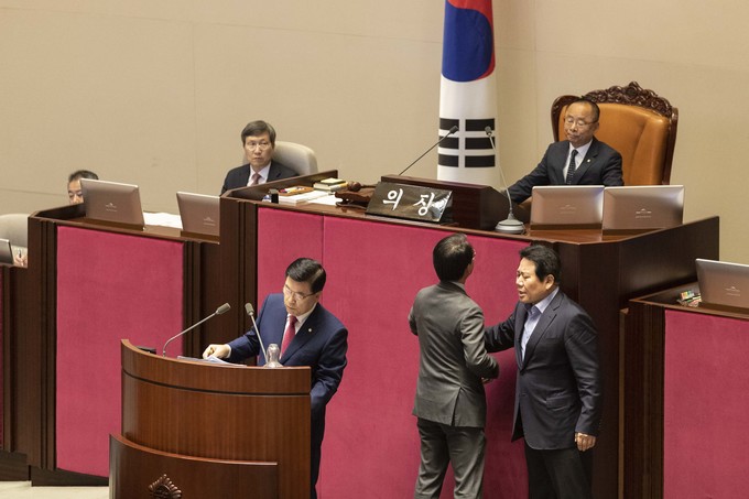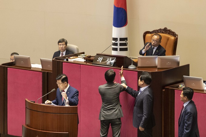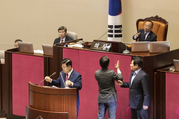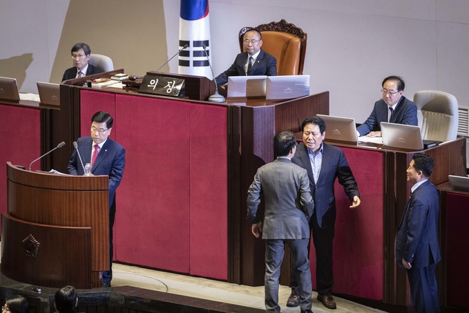 제371회 국회(정기회) 제4차 본회의가 30일 오후 서울 여의도 국회에서 열린 가운데 이주영 부의장이 의장석에 오르자 민주당 이원욱 의원이 항의하고 있다. 이주영 부의장은 지난 26일 국회 본회의를 주재하던 중 여야 협의 없이 야당 요구를 수용해 일방적으로 정회했다.
