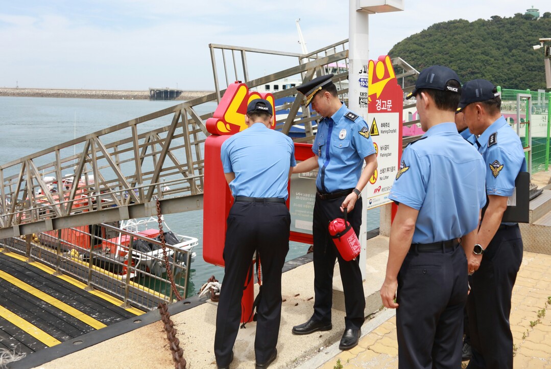 | ▲ 이명준 서해지방해양경찰청장이 12일 여름철 연안사고 위험구역인 전북 부안 하섬과 연안체험활동 사업장이 있는 전북도청 학생해양수련원을 방문해 시설물 등을 점검하고 있다. [서해해경청 제공] |