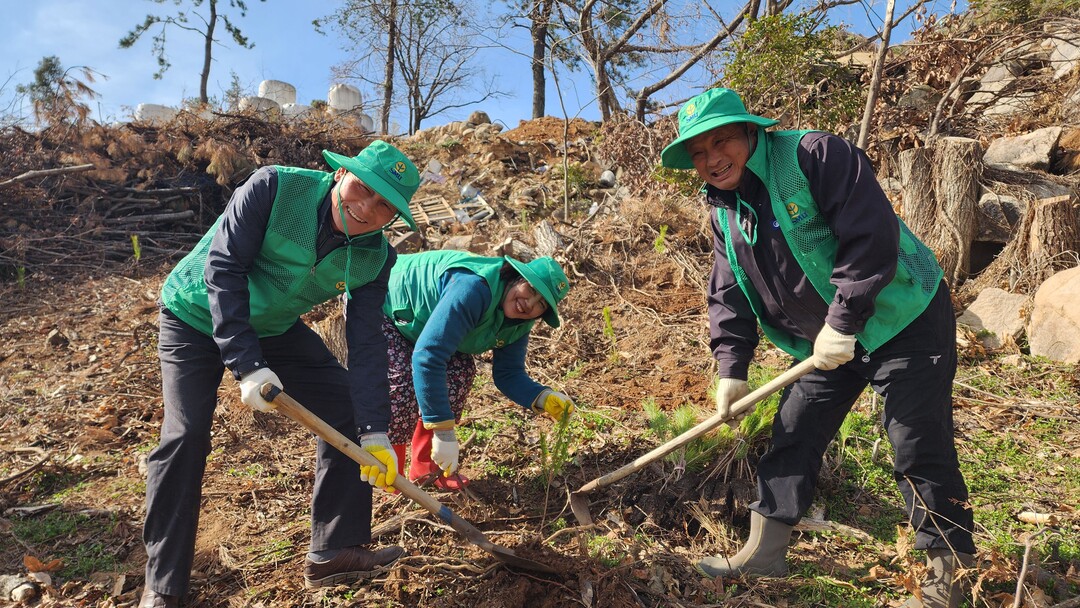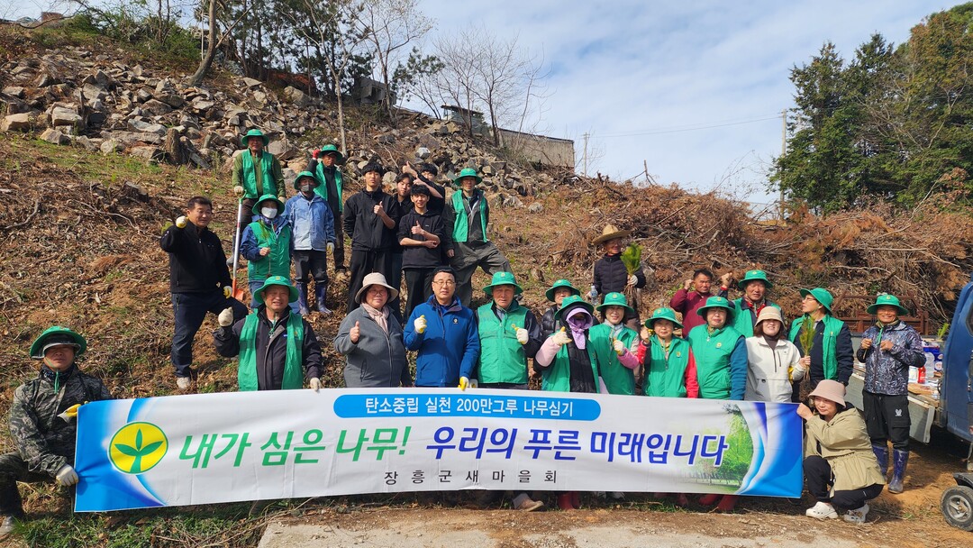 | ▲ 장흥군새마을회가 지난달 30일 새마을지도자장흥군협의회 40여명과 함께 식목일을 맞아 산불예방, 탄소중립 실천을 위한 체리나무와 은목서등 나무 400주 심기를 하고 있다. [장흥군 제공] |