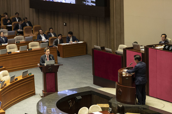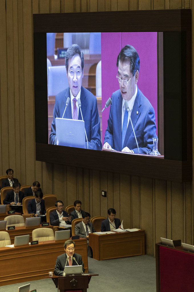 이낙연 국무총리(왼쪽)가 10일 오후 서울 여의도 국회에서 열린 본회의 대정부 질문에 출석해 더불어민주당 백재현 의원 질의에 답하고 있다.