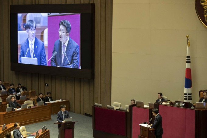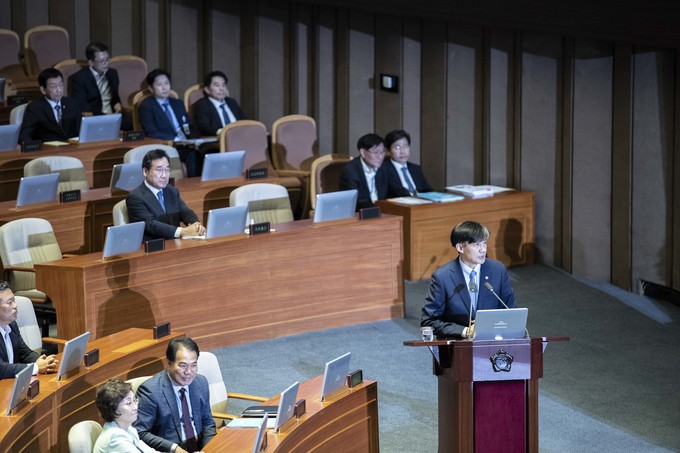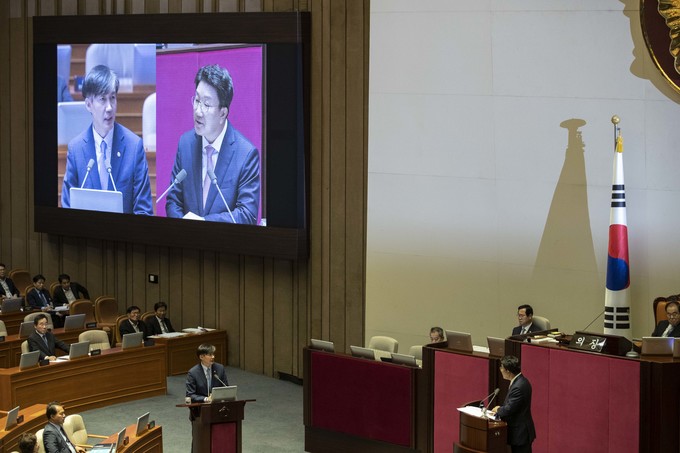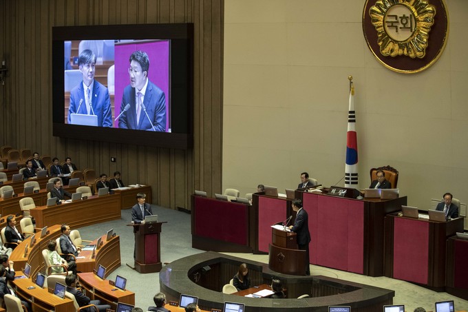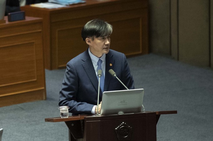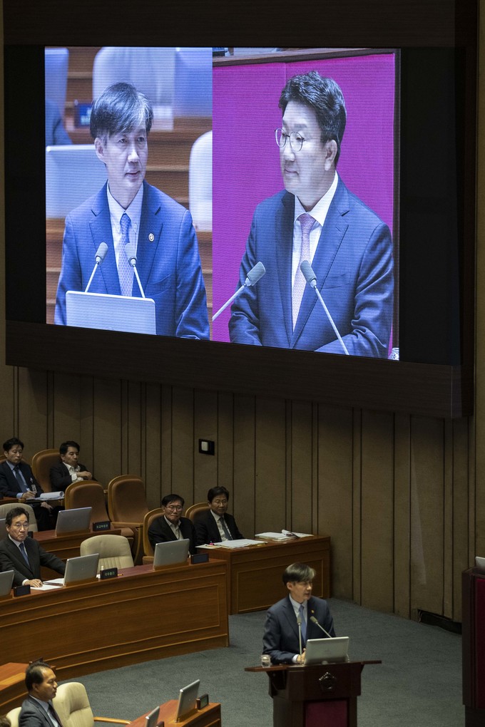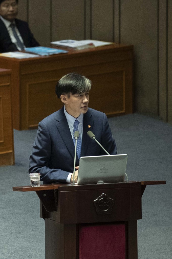 조국 법무부 장관이 26일 오후 서울 여의도 국회에서 열린 제371회 국회(정기회) 제2차 본회의 대정부질문에 출석해 자유한국당 권성동 의원 질의에 답하고 있다.