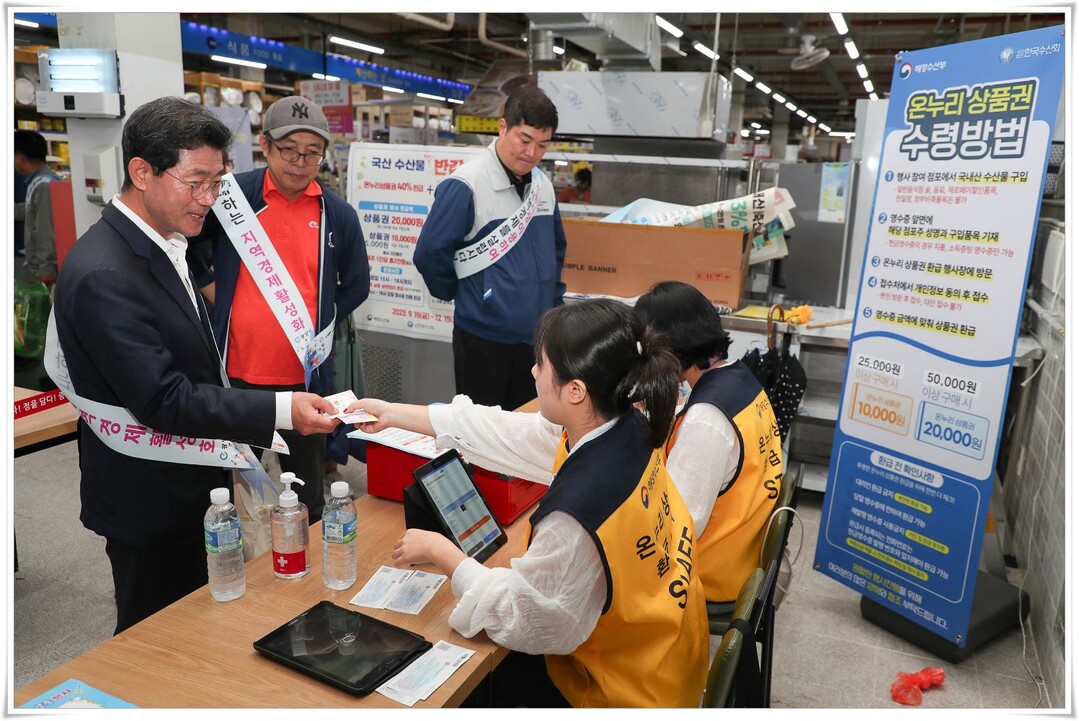 환급행사는 국내산수산물 또는 국내산수산물 원재료 비중이 70% 이상인 단순가공품을 대상으로 하며, 당일 구매금액이 △3만4000원 이상~6만7000원 미만일 경우 1만원 △6만7000원 이상은 2만 원을 온누리상품권으로 환급받을 수 있다. 단 1인 2만 원 한도다.
