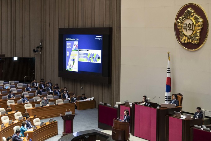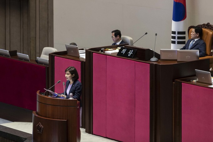 더불어민주당 박경미 의원이 11일 오후 서울 여의도 국회에서 열린 본회의 대정부 질문에서 발언하고 있다.