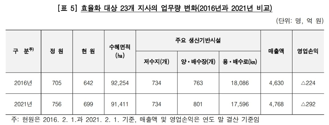 | ▲ 한국농어촌공사 23개 지사의 2016년과 2021년 업무량 변화 비교 자료 [감사원 제공] |