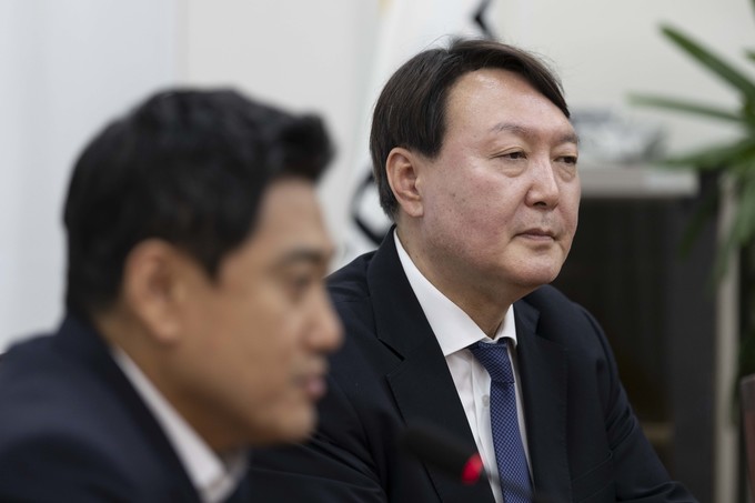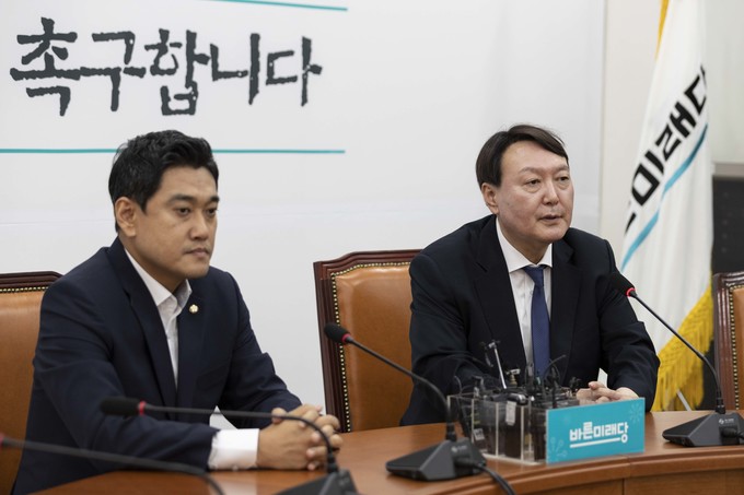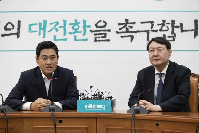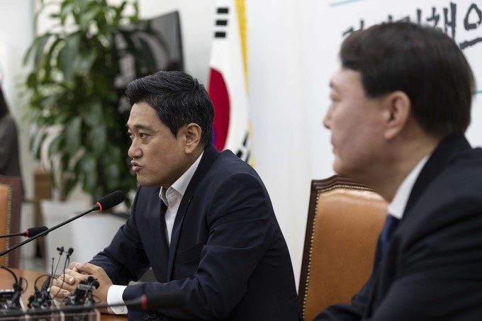 윤석열 신임 검찰총장(오른쪽)이 7일 오후 서울 여의도 국회에서 바른미래당 오신환 원내대표를 예방하고 있다.