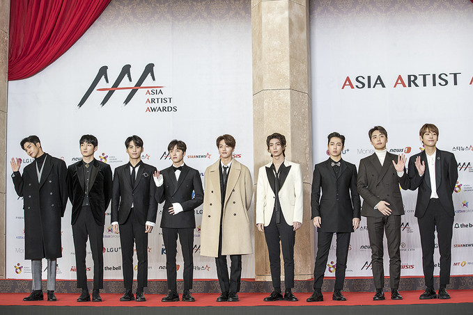 그룹 SF9이 28일 오후 인천 중구 파라다이스시티 아트스페이스 플라자에서 열린 ‘2018 AAA(Asia Artist Award)’ 레드카펫 행사에서 포즈를 취하고 있다.