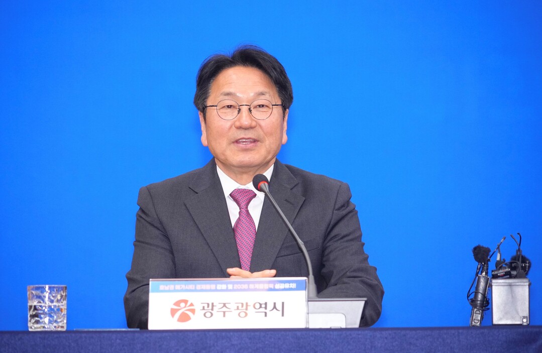| ▲ 강기정 광주광역시장이 23일 나주시청 대회의실에서 김영록 전남지사, 김관영 전북지사와 호남권 메가시티 경제동맹 강화 등을 위한 호남권 3개 시도 업무협약식에서 인사말을 하고 있다. [광주광역시 제공] |