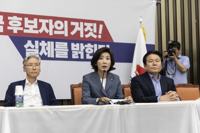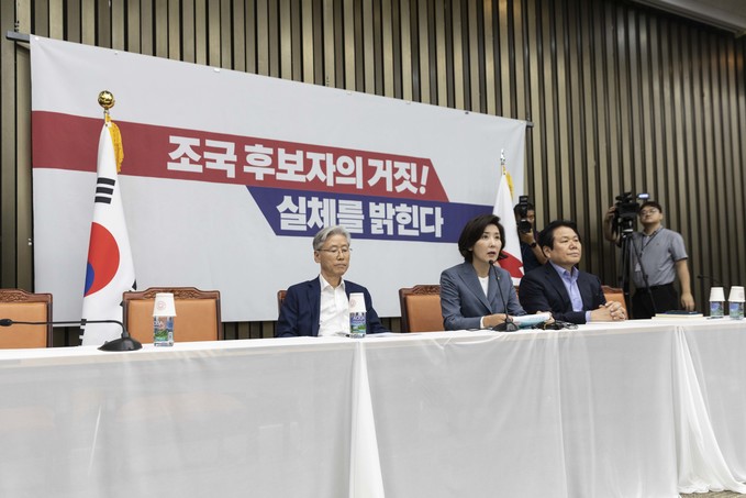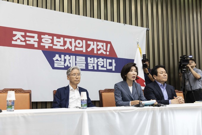 자유한국당 나경원 원내대표(가운데)가 3일 오후 서울 여의도 국회에서 열린 '조국 후보자의 거짓과 선동, 대국민 고발 언론 간담회'에 참석해 발언하고 있다.
