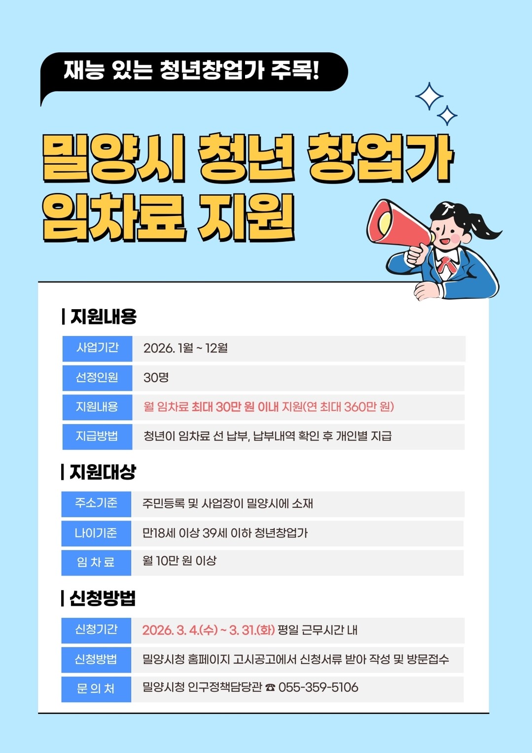 | ▲ '2026년 청년창업가 임차료 지원사업' 안내 홍보물 [밀양시 제공] |