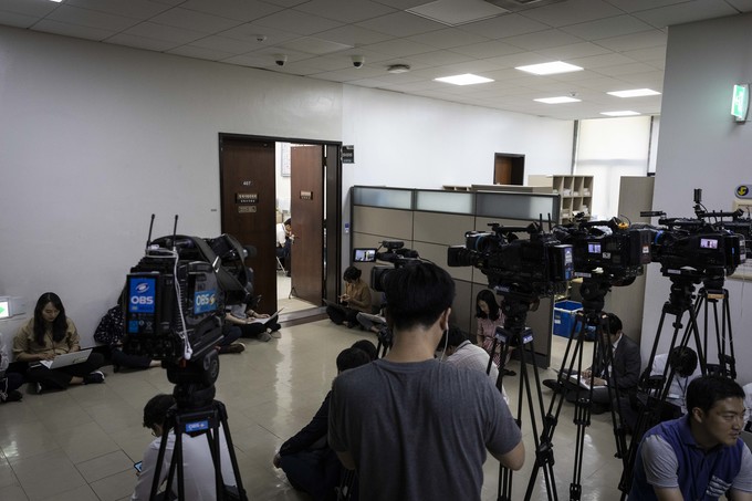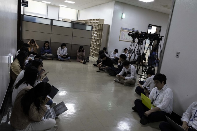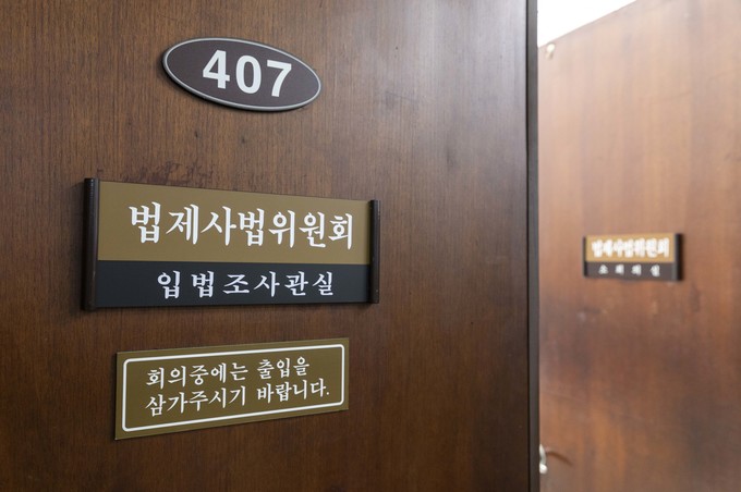 조국 법무부 장관 후보 인사청문회 일정 협의를 위한 여야 간사단 협의가 26일 오후 서울 여의도 국회 법제사법위원회 회의실에서 이루어지고 있는 가운데 취재진이 결과를 기다리고 있다.