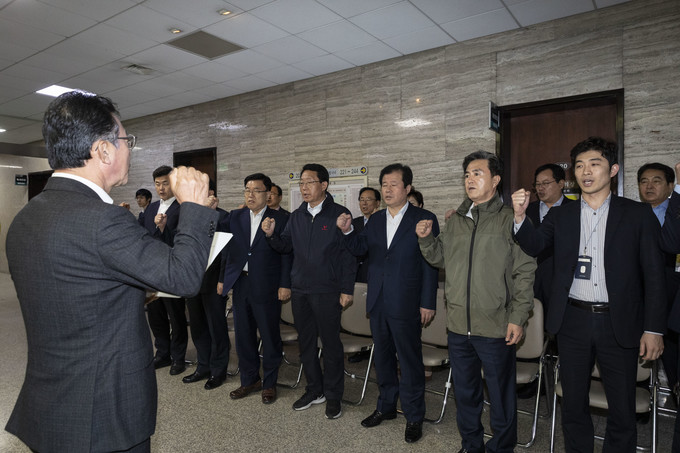 자유한국당 의원들과 보좌진들이 25일 오후 서울 여의도 국회 제5특별위원회 회의장을 막고 구호를 외치고 있다.