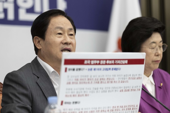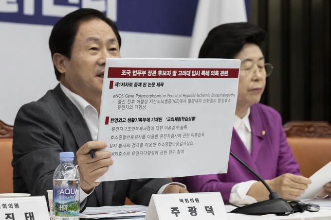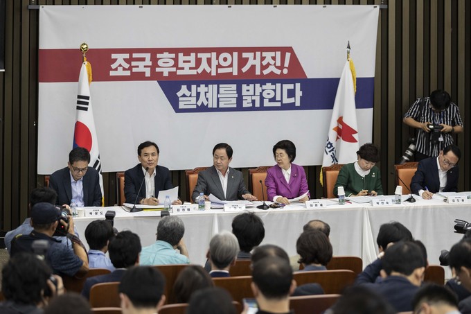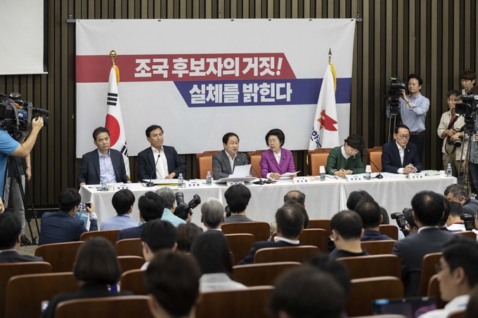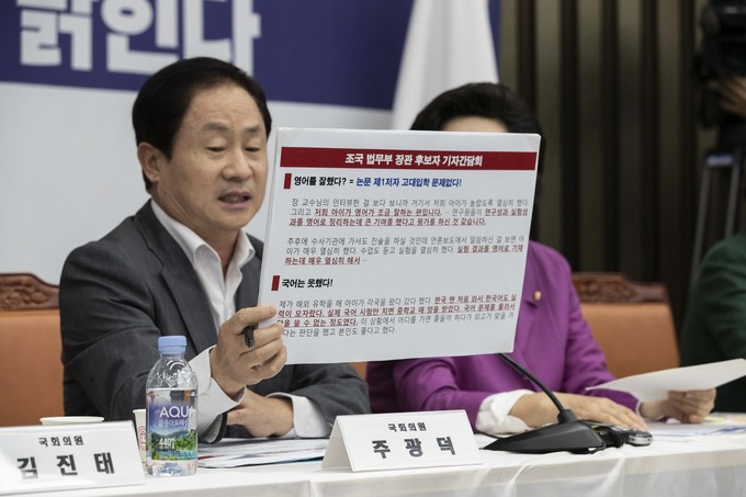 자유한국당 주광덕 의원(왼쪽 세번째)이 3일 오후 서울 여의도 국회에서 열린 '조국 후보자의 거짓과 선동, 대국민 고발 언론 간담회'에 참석해 발언하고 있다.