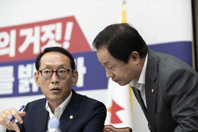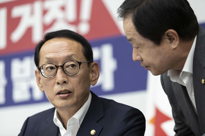 한국당 '조국 후보자의 거짓과 선동, 대국민 고발 언론 간담회'가 3일 오후 서울 여의도 국회에서 열린 가운데 자유한국당 김도읍 의원(왼쪽)과 주광덕 의원이 이야기를 하고 있다.