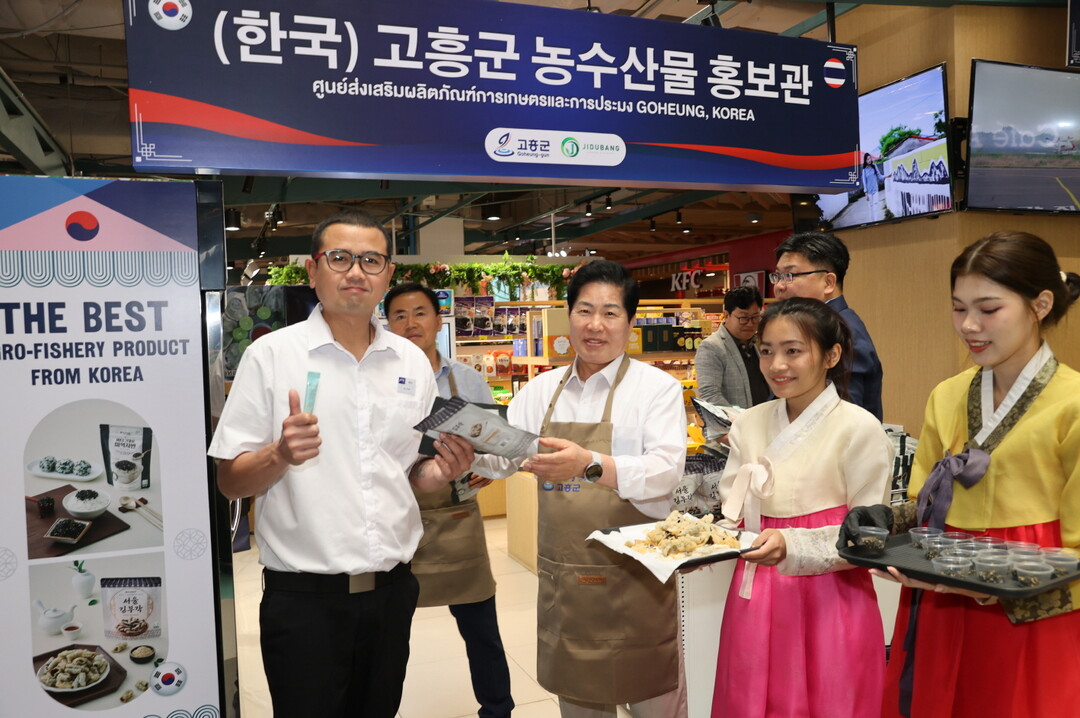 | ▲ 22일 공영민 고흥군수가 태국 방콕 파라다이스 몰에서 열린 고흥 김 판촉 행사에서 고객에게 사은품을 나눠주며 고흥 농수산물을 홍보하고 있다. [고흥군 제공] |