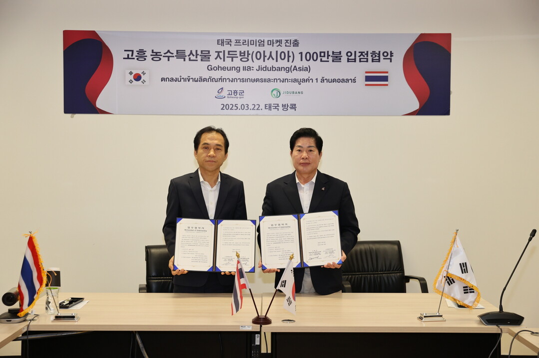 | ▲ 공영민 고흥군수(오른쪽)와 임준호 태국 지두방아시아 대표(왼쪽)가 지난 22일 100만 달러 규모의 농수산물 입점 협약서를 들고 기념 촬영을 하고 있다. [고흥군 제공] |