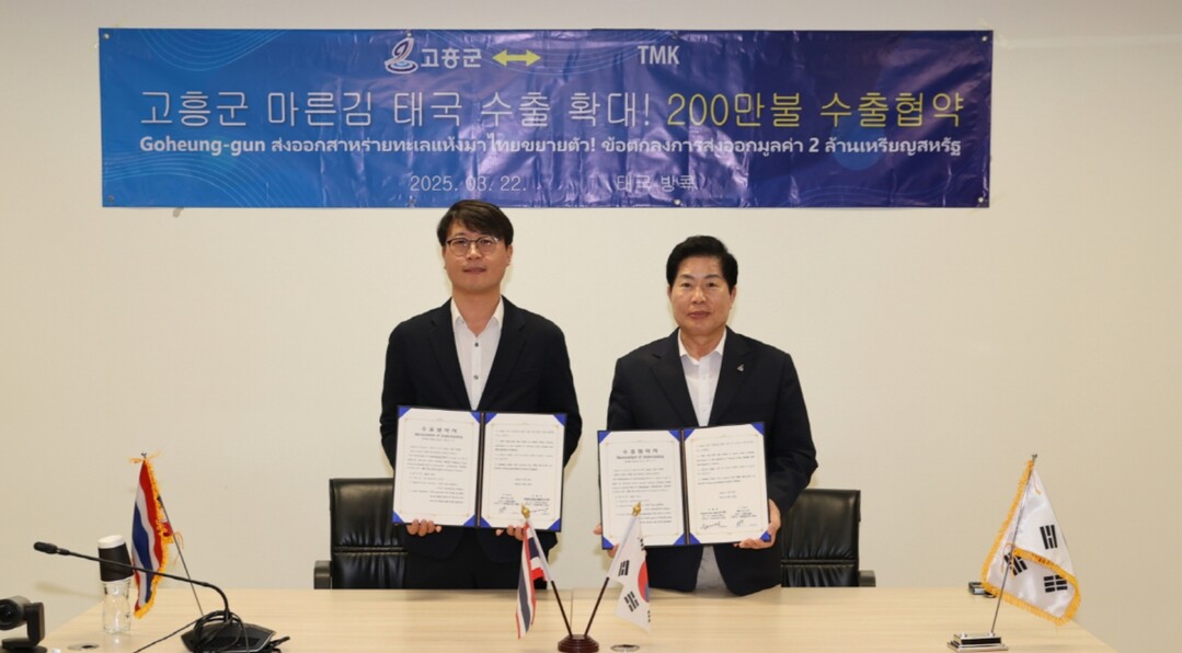 | ▲ 공영민 고흥군수(오른쪽)와 강병수 TMK(왼쪽)대표가 지난 22일 200만 달러 규모의 마른 김 수출 협약서를 들고 기념 촬영을 하고 있다. [고흥군 제공] |