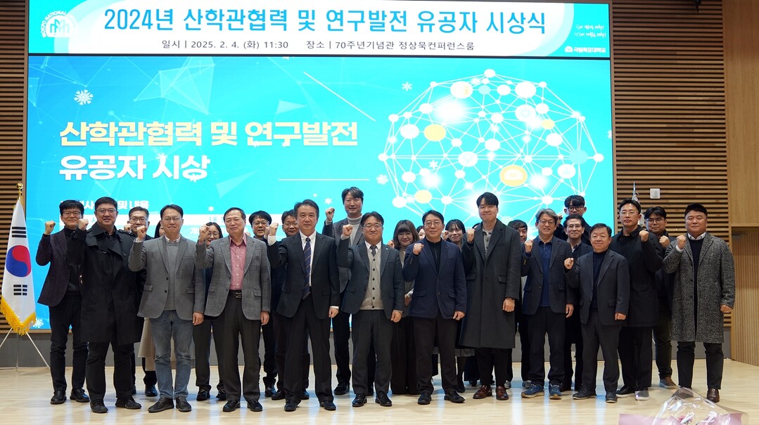 | ▲ 국립목포대학교 산학협력단이 4일 '2024년 산학관 협력과 연구발전 유공자 시상식'을 개최한 뒤 수상자들과 기념촬영을 하고 있다. [목포대 제공] |