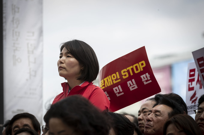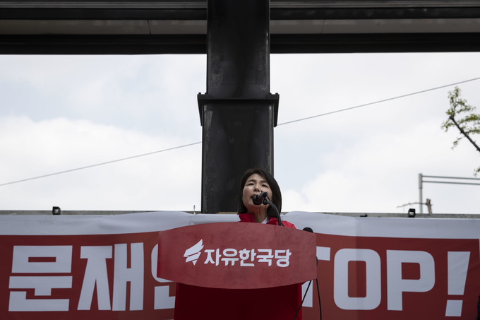 전희경 자유한국당 의원이 20일 오후 서울 종로구 세종문화회관 앞에서 열린 '문재인 STOP! 국민이 심판합니다' 규탄대회에 참석하고 있다.