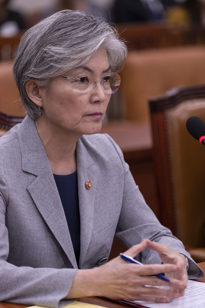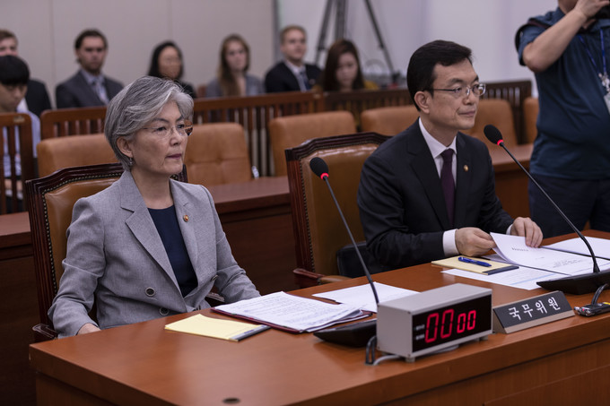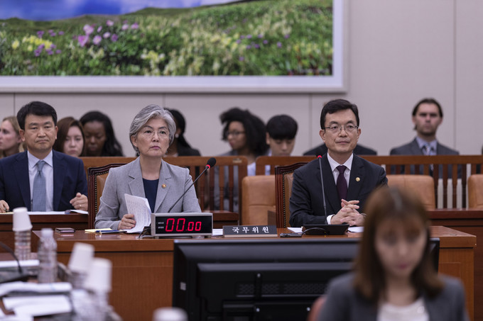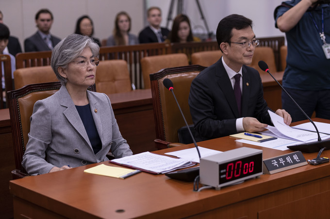 강경화 외교부 장관(왼쪽)이 22일 오후 서울 여의도 국회에서 열린 '일본 정부의 보복적 수출규제 조치 철회 촉구'를 위한 외교통일위원회 전체회의에 참석하고 있다.